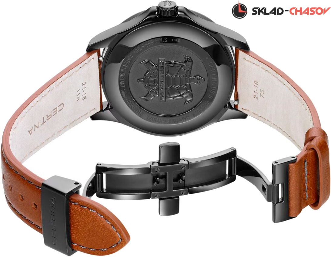 D 41,5мм, толщина 9,82мм, ширина ремешка 21мм, вес 85г