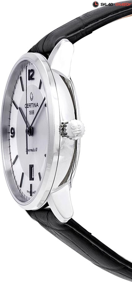 Накладные метки в виде штрихов и арабских цифр. Окошко даты находится в положении 6 часов. Прозрачная задняя крышка. Рифленая заводная головка. Удобный кожаный ремешок с классической застежкой.
