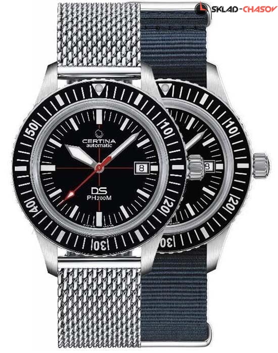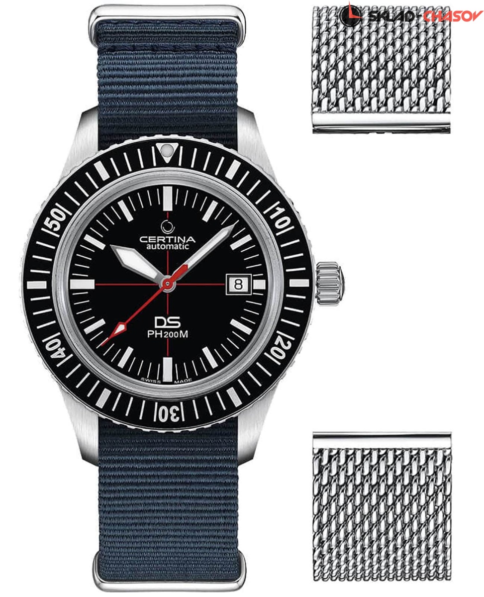 Оригинальный чёрный циферблат понравится ценителям ретро-дизайна. В комплекте с тканевым ремешком вы получаете дополнительный вариант из стали. Меняя их, вы можете экспериментировать с разными стилями. Уникальностью обладает не только аксессуар, но и упаковка, сделанная в виде бокса для дайвинга. Часы комплектуются автоматическим механизмом ETA Powermatic 80 с 80-часовым запасом хода. Технология DS Concept. Стекло с покрытием Nex scratchguard, устойчивым к царапинам. Вращающийся безель. Диаметр корпуса: 42,8 мм.