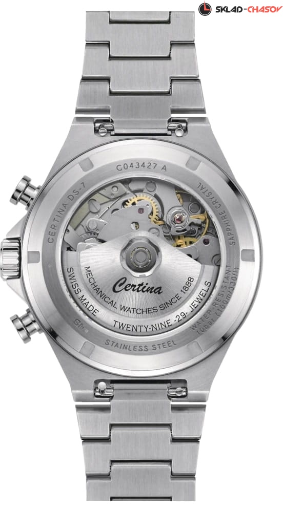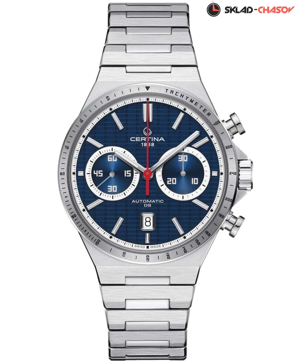 Мужские часы-хронограф Certina DS-7 Chrono Auto C043.427.11.041.00. Корпус часов изготовлен из нержавеющей стали 316L. Под твердым сапфировым стеклом с антибликовым покрытием Окошко даты в положении 6 часа, а также маркировку, покрытую люминесцентным покрытием Super-LumiNova. Класс водозащиты: 100 метров, позволит плавать, нырять и заниматься другими водными видами спорта. Стальной браслет на застёжке-бабочке с кнопками.Тахиметр.