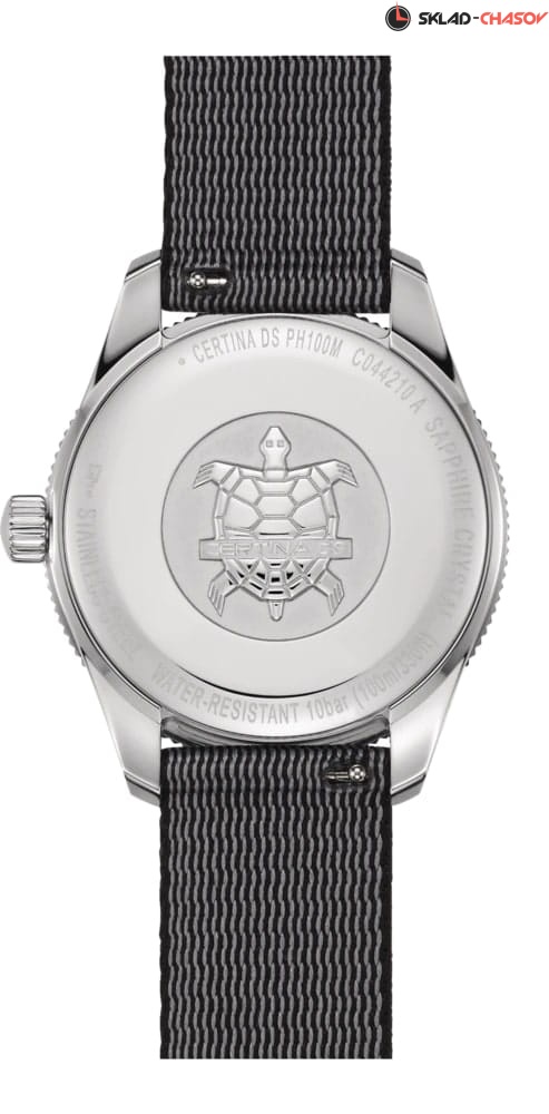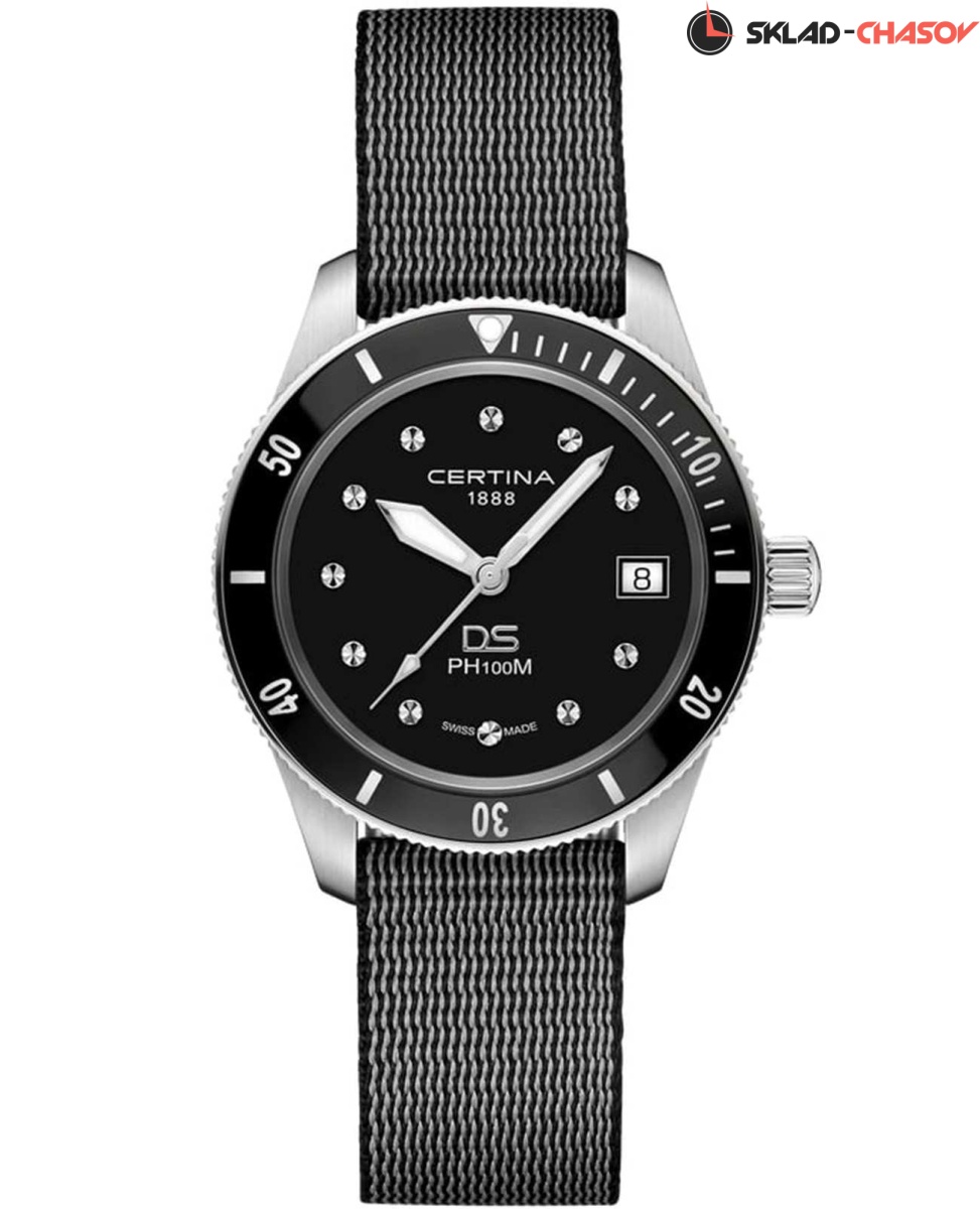Certina DS PH100M Lady C044.210.18.051.00 – часы для поклонников ярких аксессуаров. Корпус изготовлен из высококачественной нержавеющей стали 316L с . Под твердым сапфировым стеклом с антибликовым покрытием находится черный циферблат на котором вы найдете окошко даты в положении 3 часа, а также маркировку, покрытую люминесцентным покрытием Super-LumiNova. Класс водозащиты: 100 метров, позволит плавать, нырять и заниматься другими водными видами спорта. Тканевый ремешок. Безель из нержавеющей стали с PVD-покрытием.