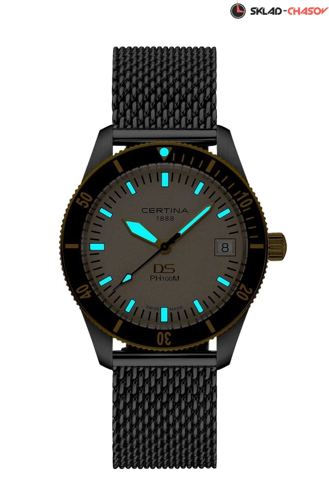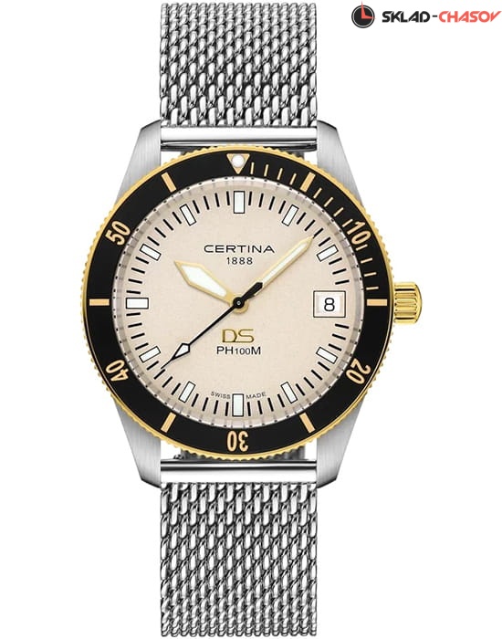Certina DS PH100M Gent C044.410.21.030.00– часы для поклонников ярких аксессуаров. Корпус изготовлен из высококачественной нержавеющей стали 316L с . Под твердым сапфировым стеклом с антибликовым покрытием находится бежевый циферблат на котором вы найдете окошко даты в положении 3 часа, а также маркировку, покрытую люминесцентным покрытием Super-LumiNova. Класс водозащиты: 100 метров, позволит плавать, нырять и заниматься другими водными видами спорта. Стальной ремешок миланского плетения на застёжке-бабочке с кнопками. Безель из нержавеющей стали с PVD-покрытием.