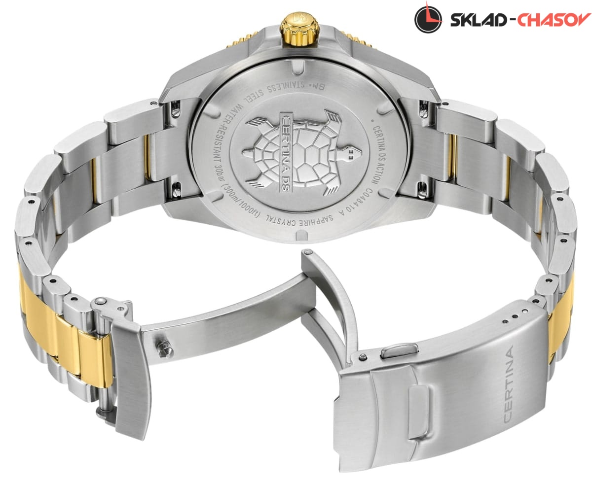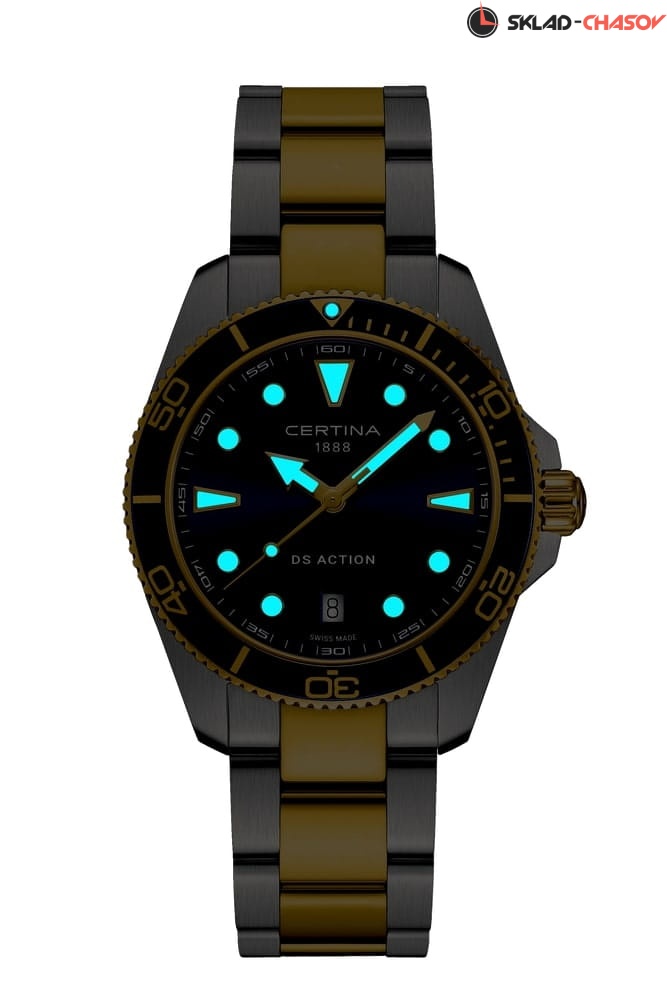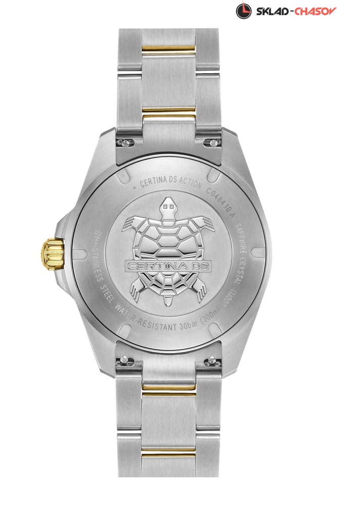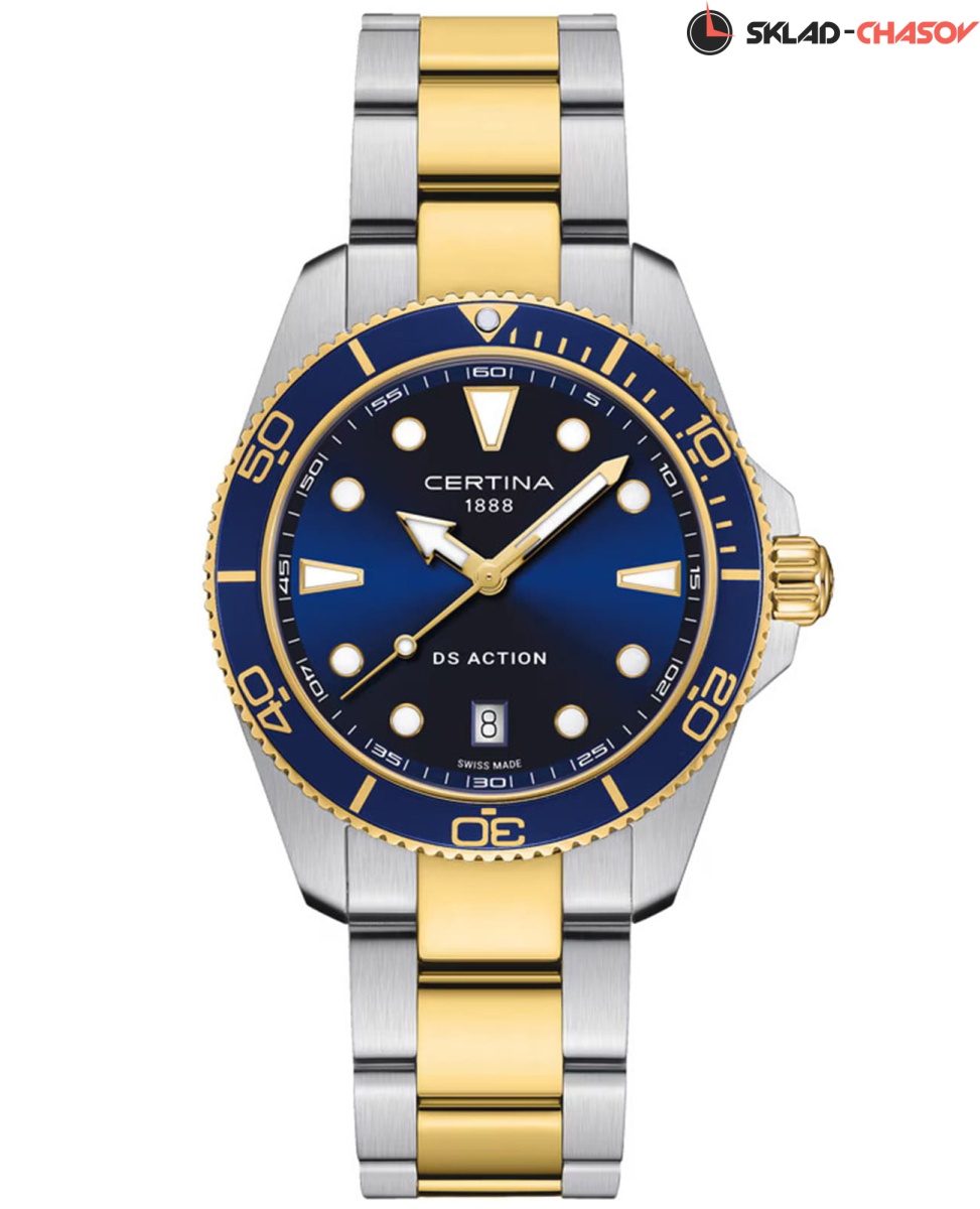 Certina DS Action C048.410.22.041.00 – элегантные мужские часы, сочетающие современный стиль и надёжную функциональность. Корпус диаметром 40 мм выполнен из нержавеющей стали 316L с частичным PVD-покрытием, придающим модели утончённый вид. Синий циферблат с метками и стрелками, покрытыми люминесцентным покрытием, обеспечивает отличную читаемость в любых условиях, а его поверхность защищена сапфировым стеклом с антибликовым покрытием, устойчивым к царапинам. Часы оснащены швейцарским кварцевым механизмом ETA F06.412 с технологией Precidrive™, обеспечивающей исключительную точность хода. Функция EOL (индикатор окончания заряда батареи) предупреждает о необходимости замены элемента питания. Браслет из нержавеющей стали 316L с частичным PVD-покрытием оснащён системой быстрой замены, позволяющей легко адаптировать стиль часов. Водонепроницаемость 300 метров (30 бар) делает модель идеальным выбором для плавания и дайвинга.