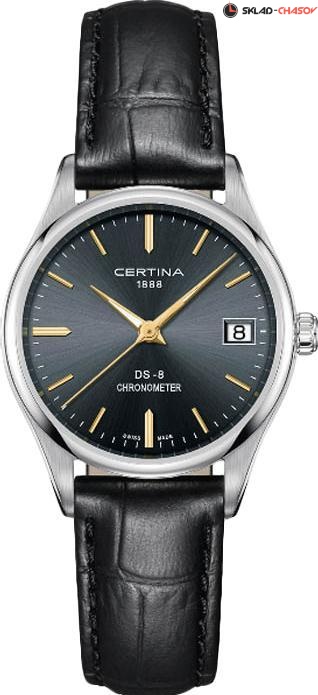 Женские наручные часы Certina DS-8 C033.251.16.351.01. Точный кварцевый механизм с аналоговой индикацией. Корпус изготовлен из высококачественной нержавеющей стали 316L с высокими антикоррозийными свойствами. На стрелки и отметки нанесен светонакопительный состав, благодаря этому считывать информацию с циферблата возможно и в темноте. На циферблате отображается текущее число месяца. Ремешок изготовлен из кожи. Сапфировое стекло. Искусственно изготовленное стекло с высокой прочностью и устойчивостью к царапинам. Часы являются водонепроницаемыми до 10 Бар. Цвет корпуса: Серебристый. Цвет циферблата: Черный. Ширина (с заводной головкой): 30мм. Толщина: 9мм. Гарантия: 2 года.