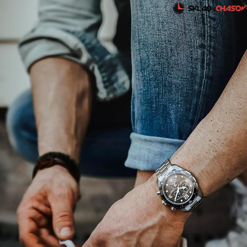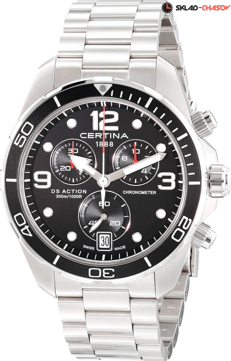 Мужские наручные часы Certina DS Action C032.434.11.057.00. Точный кварцевый механизм с аналоговой индикацией. Корпус изготовлен из высококачественной нержавеющей стали 316L с высокими антикоррозийными свойствами. На стрелки и отметки нанесен светонакопительный состав, благодаря этому считывать информацию с циферблата возможно и в темноте. На циферблате отображается текущее число месяца. Функция хронографа. Браслет из нержавеющей стали. Сапфировое стекло. Искусственно изготовленное стекло с высокой прочностью и устойчивостью к царапинам. Часы являются водонепроницаемыми до 30 Бар. Цвет корпуса: Серебристый. Цвет циферблата: Черный. Ширина (с заводной головкой): 43мм. Толщина: 14мм. Гарантия: 2 года.
