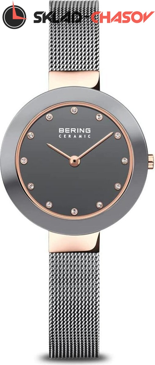 Женские аналоговые кварцевые наручные часы Ceramic collection. Механизм MIYOTA 9T22. Центральные часовая и минутная стрелки. Серый циферблат с часовыми метками в виде кристаллов. Круглый стальной корпус с покрытием цвета розового золота, серый керамический безель. Диаметр корпуса 29 мм, толщина 6 мм. Устойчивое к возникновению мелких царапин плоское сапфировое стекло. Стальной браслет миланского плетения с покрытием серого цвета. Ширина браслета 10 мм. Водозащита WR 50 (мытьё рук, дождь)