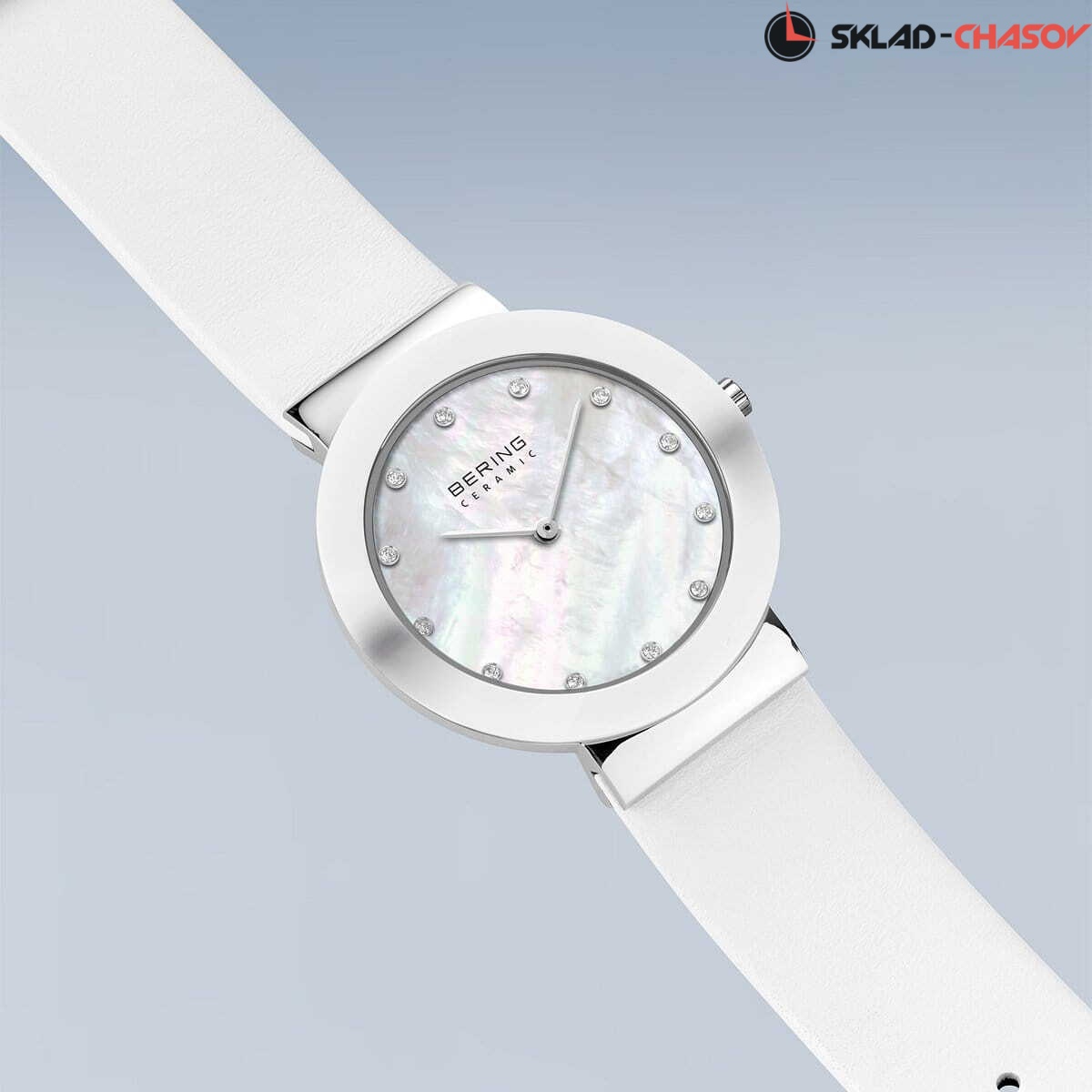 Женские аналоговые кварцевые наручные часы Ceramic collection. Механизм MIYOTA 9T22. Центральные часовая и минутная стрелки. Белый перламутровый циферблат с часовыми метками в виде кристаллов. Круглый стальной корпус с белым керамическим безелем. Диаметр корпуса 29 мм, толщина 6 мм. Устойчивое к возникновению мелких царапин плоское сапфировое стекло. Белый кожаный ремешок с классической застёжкой buckle. Ширина ремешка 18 мм. Водозащита WR 50 (мытьё рук, дождь)