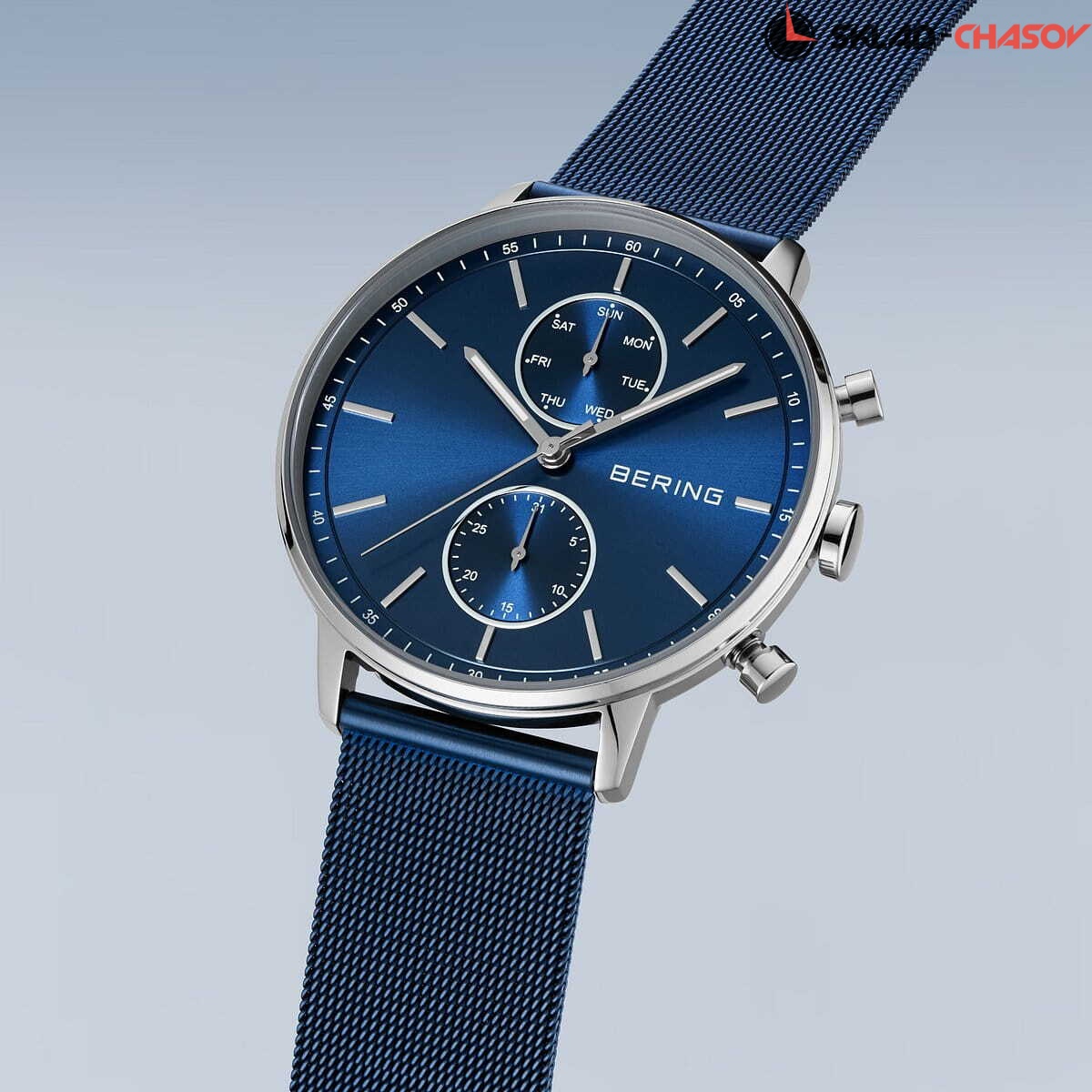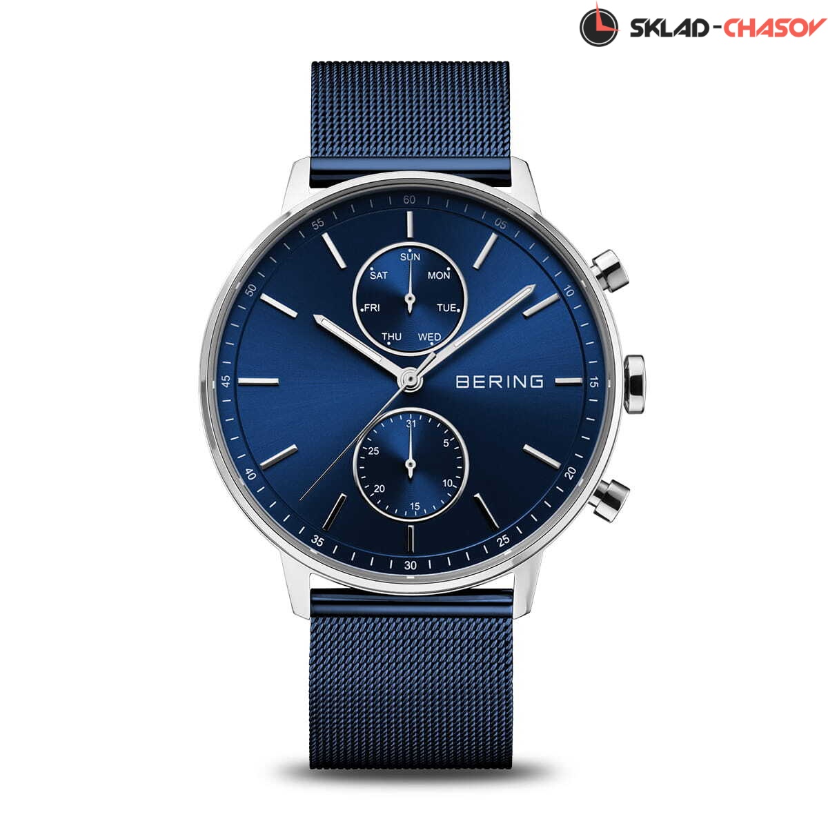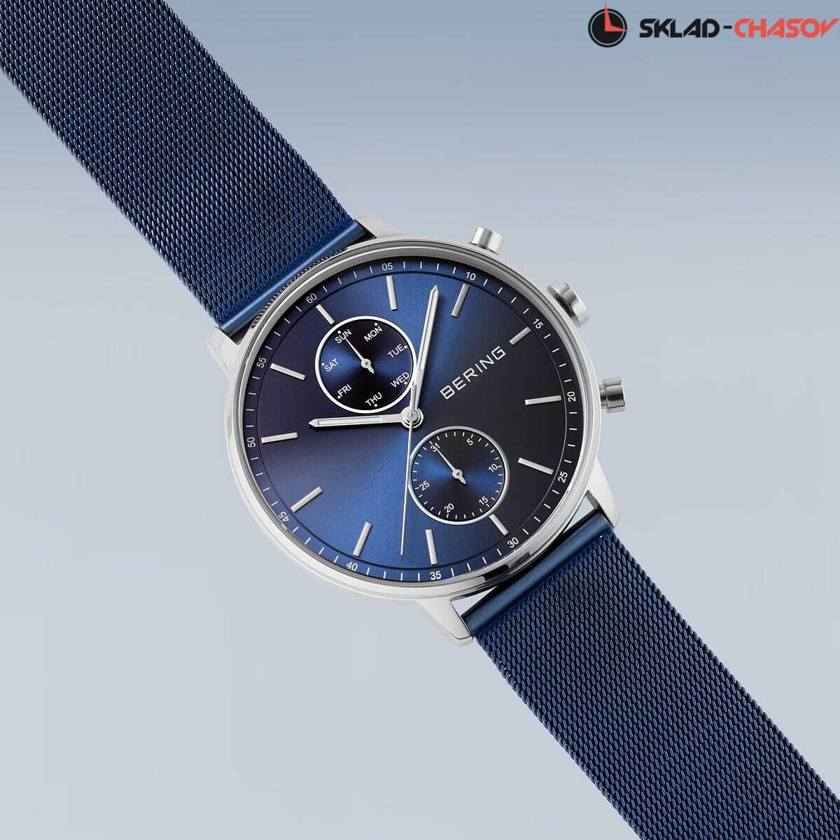 Мужские кварцевые аналоговые наручные часы. Коллекция Classic. Центральные часовая, минутная и секундная стрелки. Синий циферблат с часовыми метками в виде штрихов. Минутная шкала на циферблате. Стрелки с люминесцентным покрытием, которое светится в темноте после непродолжительного воздействия света. Дата и день недели вынесены на отдельные малые циферблаты. Круглый стальной корпус диаметром 42 мм, толщиной 10 мм. Устойчивое к возникновению мелких царапин плоское сапфировое стекло. Стальной браслет миланского плетения с покрытием синего цвета. Водозащита WR 30 (брызги).
