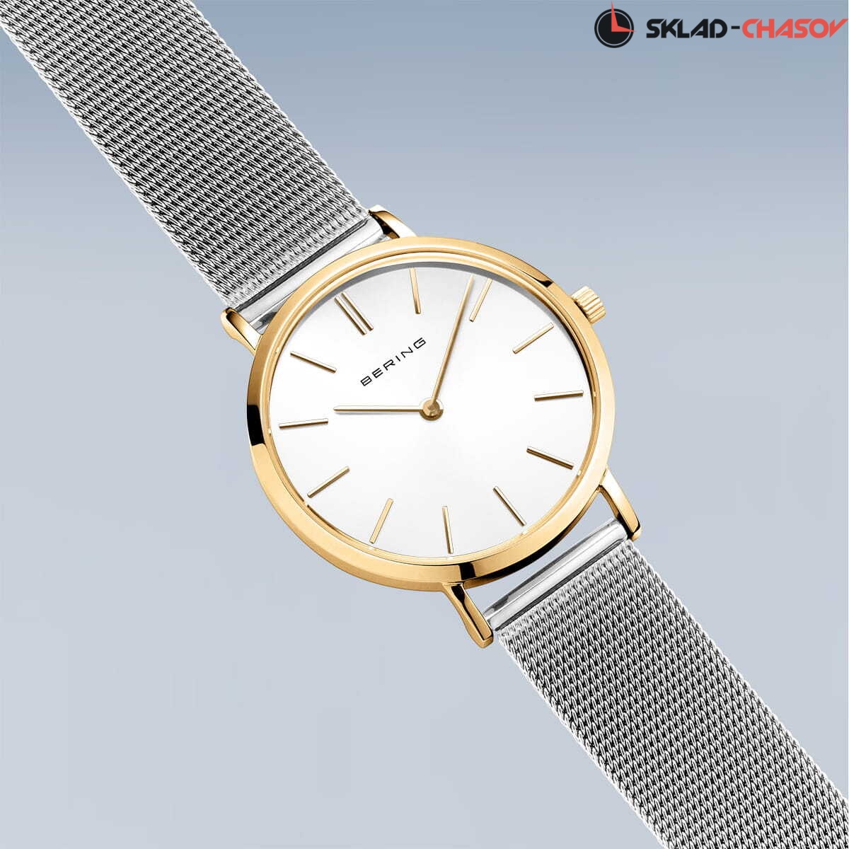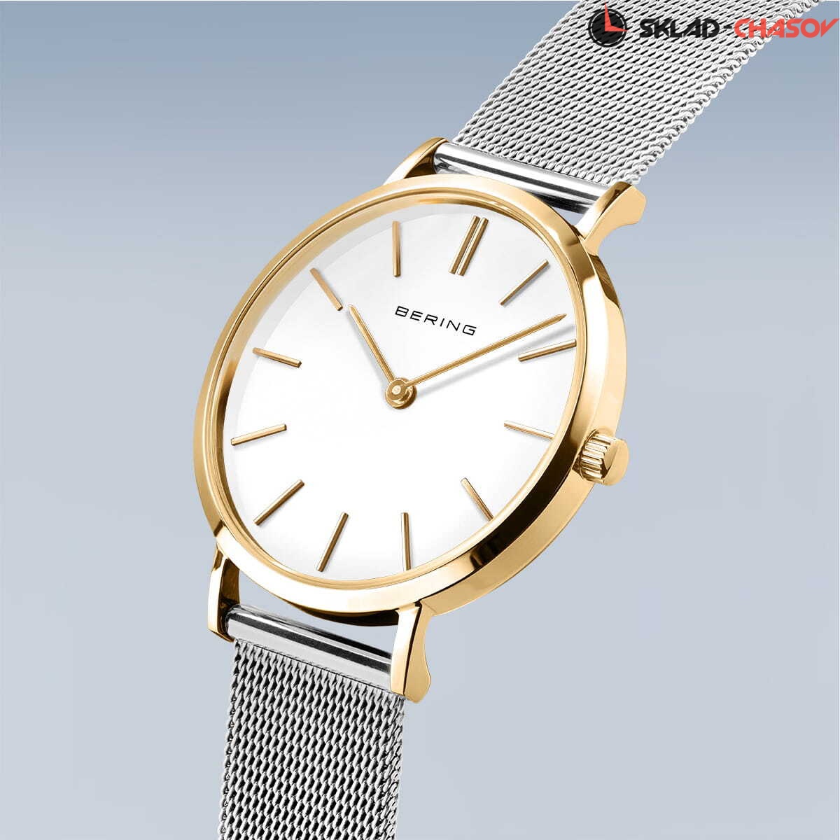 Женские аналоговые кварцевые наручные часы. Classic Collection. Механизм MIYOTA 9T22. Центральные часовая и минутная стрелки. Белый циферблат с часовыми метками в виде штрихов. Круглый стальной полированный корпус с покрытием цвета жёлтого золота. Диаметр корпуса 34 мм, толщина 6 мм. Устойчивое к возникновению мелких царапин плоское сапфировое стекло. Стальной браслет миланского плетения шириной 16 мм. Водозащита WR 30 (брызги).