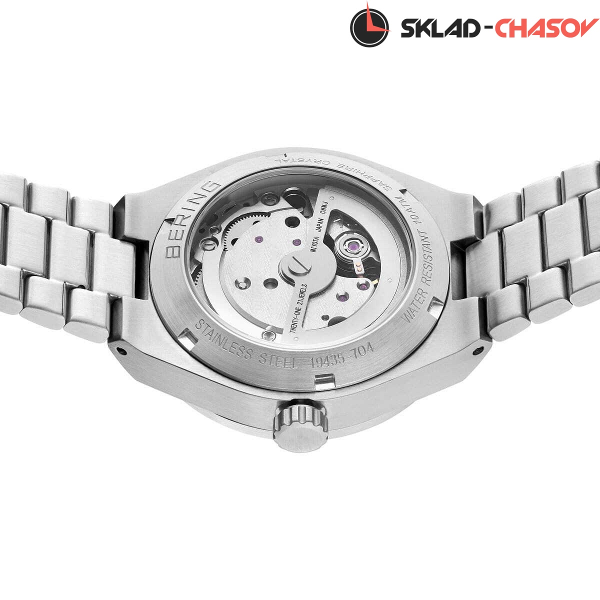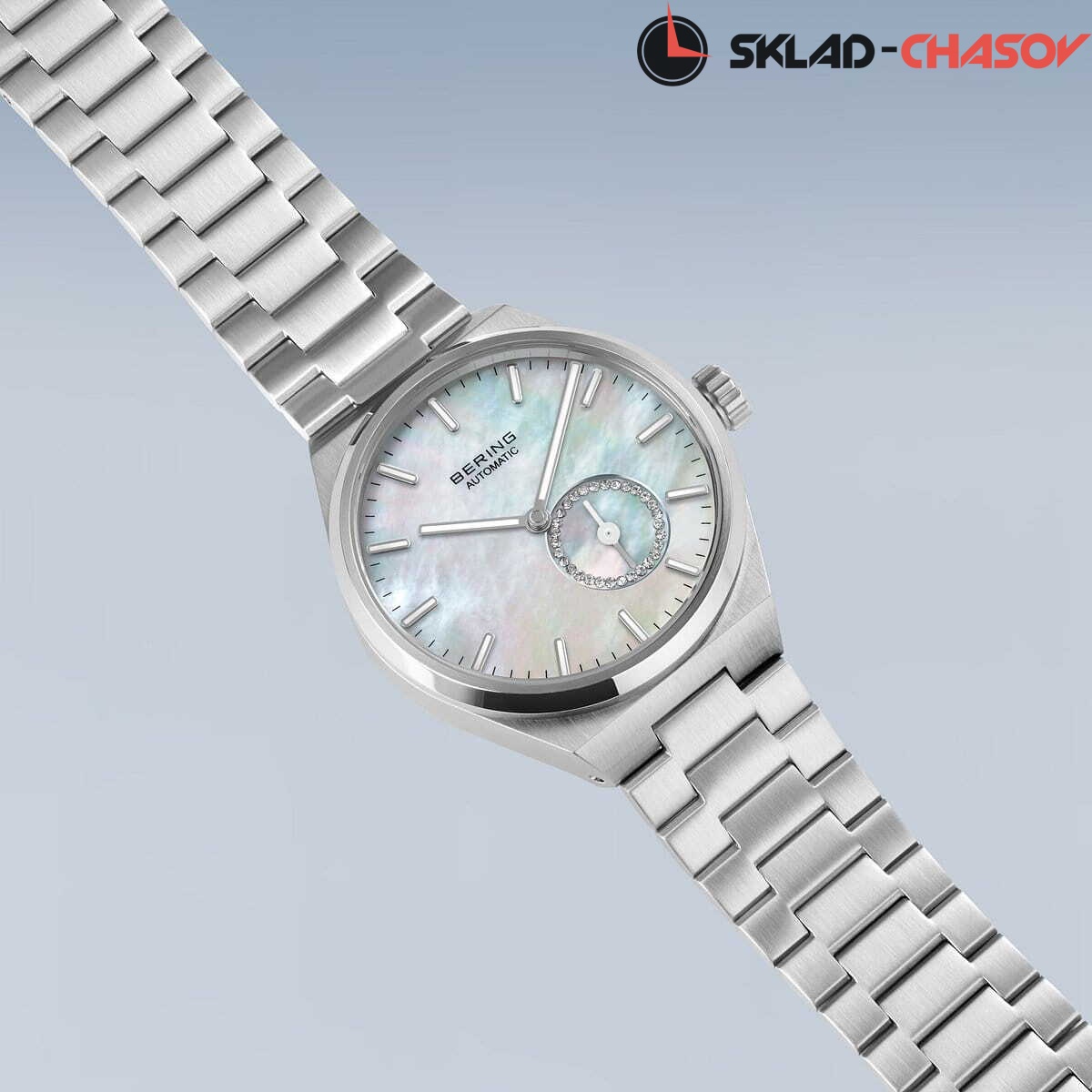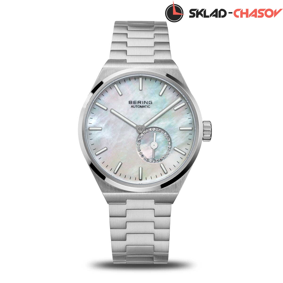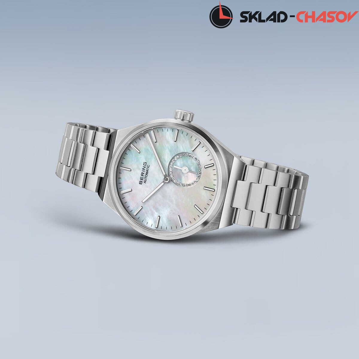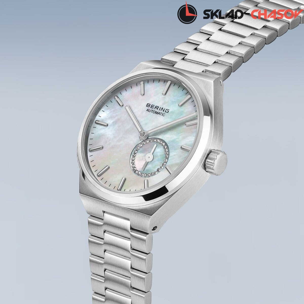Женские аналоговые механические часы с автоподзаводом (используется пружинный источник энергии и специальный механизм, который вращается при движении руки и заводит основную пружину автоматически). Механизм Miyota 82S5. Центральные часовая и минутная стрелки, секундная стрелка вынесена на дополнительный малый циферблат, украшенный кристаллами. Перламутровый циферблат с часовыми метками в виде штрихов. Стрелки и метки с люминесцентным покрытием, которое светится в темноте после непродолжительного воздействия света. Круглый корпус из нержавеющей стали. Диаметр корпуса 35 мм, толщина 12 мм. Устойчивое к возникновению мелких царапин плоское сапфировое стекло. Стальной браслет шириной 11 мм, раскладывающаяся застёжка. Прозрачная задняя крышка. Водостойкость WR 100 (плавание без акваланга).