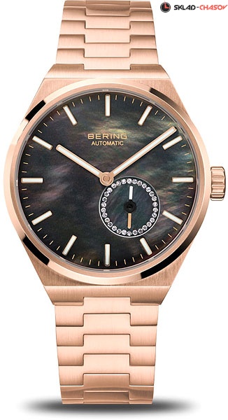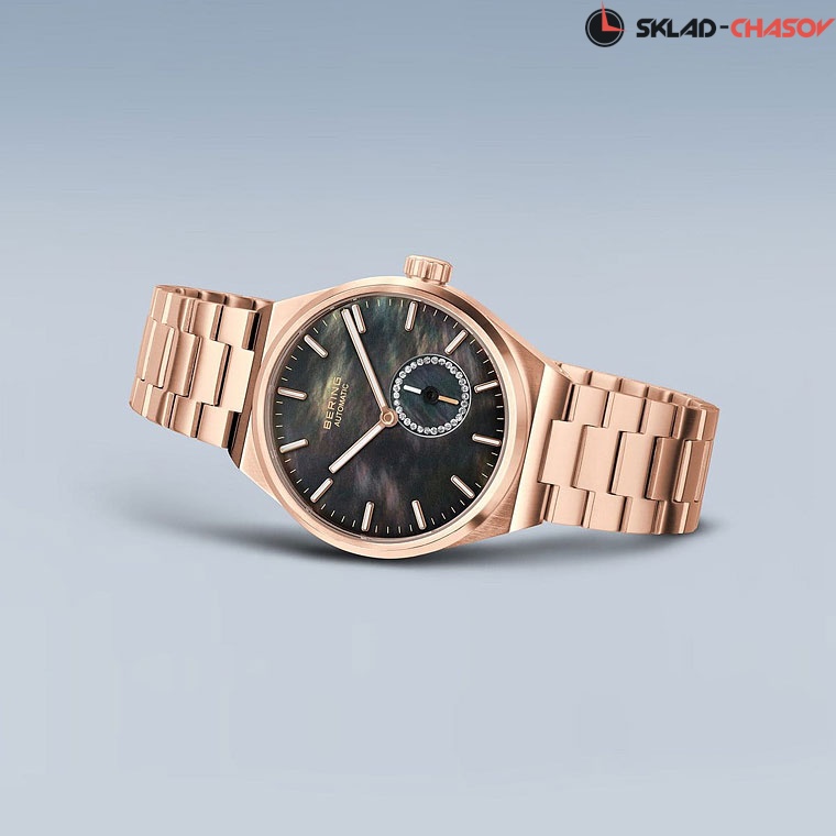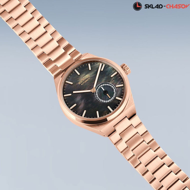 • Перламутровый черный циферблат. Циферблат секундной стрелки украшен фианитами.