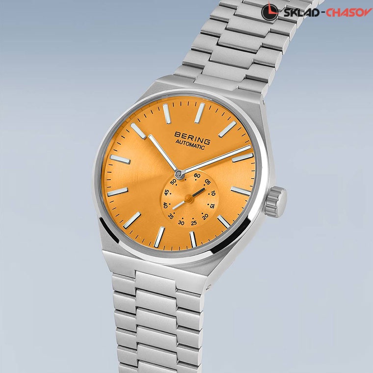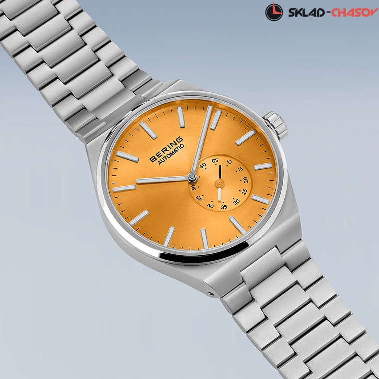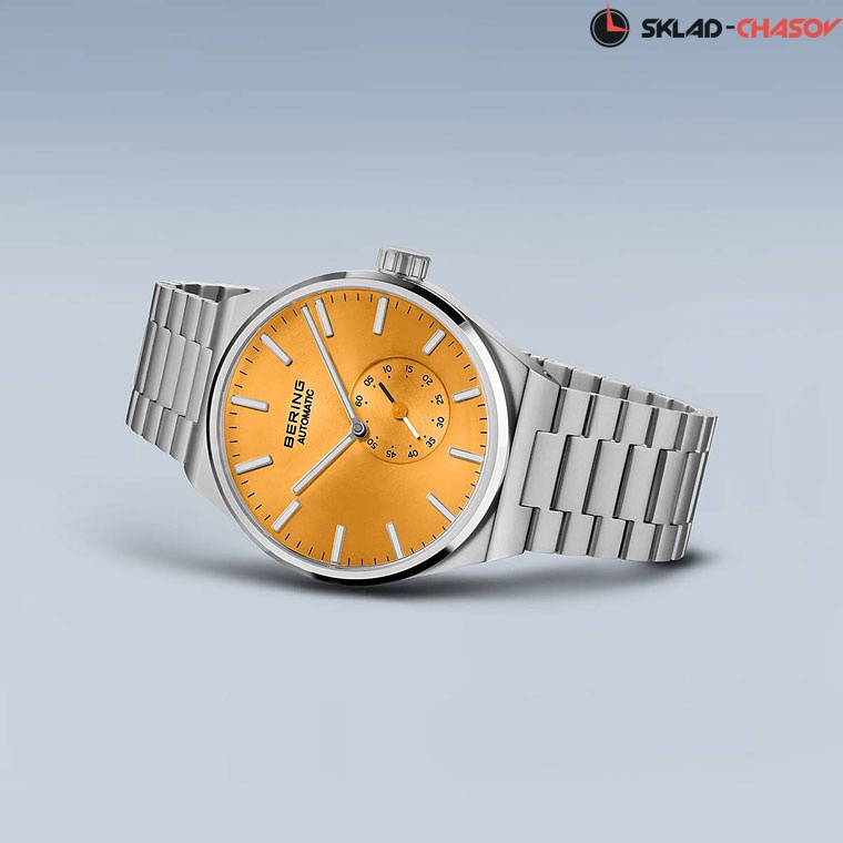 • Оранжевый циферблат с гильошированием в виде солнечных лучей. Секундная стрелка вынесена на отдельный циферблат оранжевого цвета.