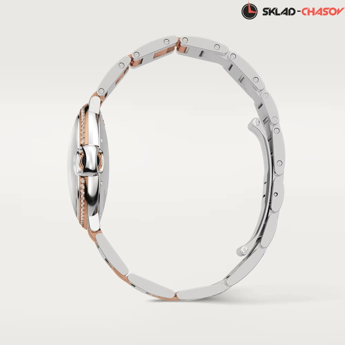 Модель Cartier W3BB0004 с литым браслетом из нержавеющей стали и розового золота 18K, браслетная застежка “бабочка”.