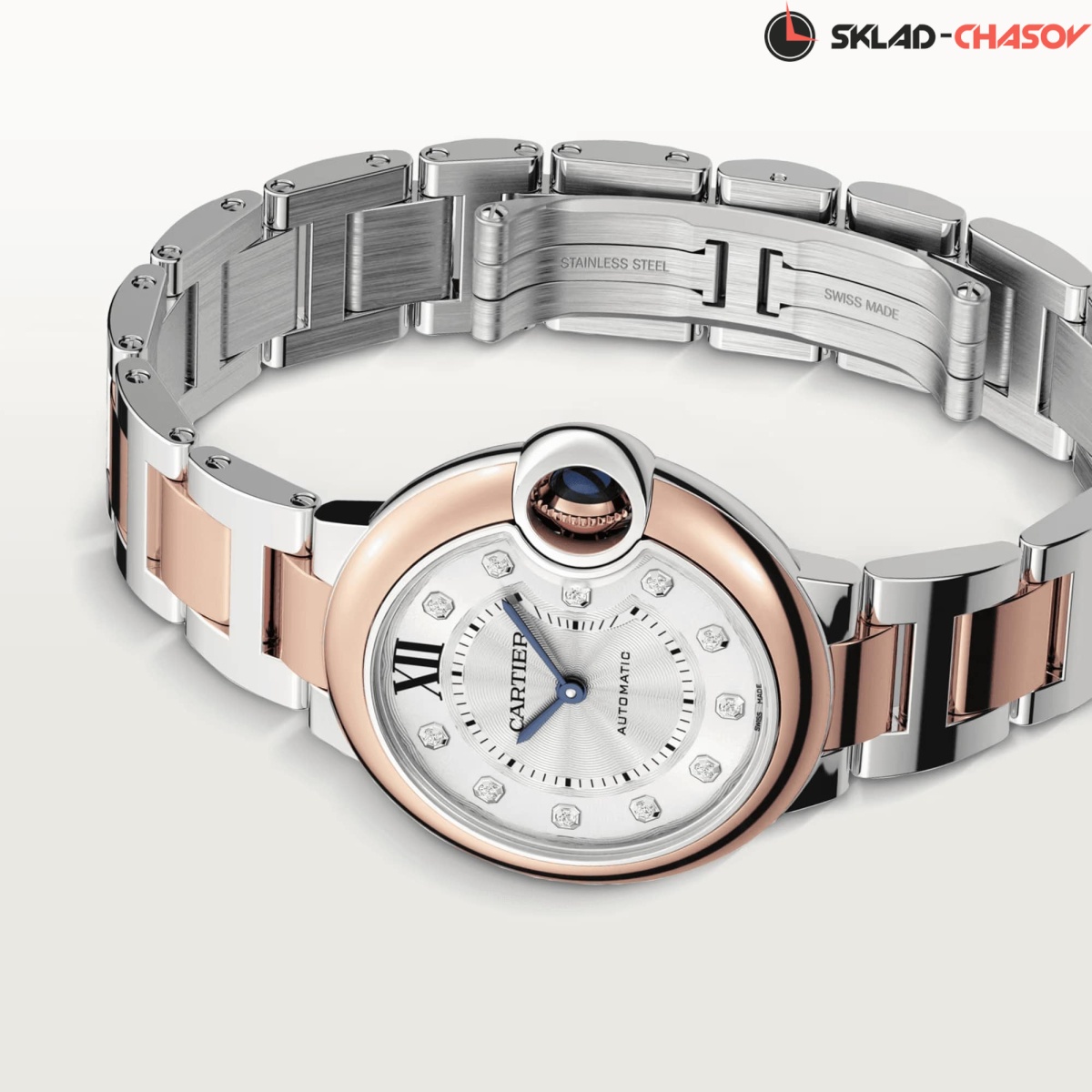 Модель Cartier W3BB0021 с литым браслетом из нержавеющей стали и розового золота 18K, браслетная застежка “бабочка”.