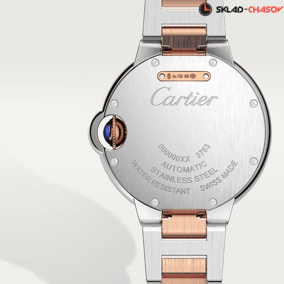 Круглый корпус модели Ballon Bleu de Cartier W3BB0021 выполнен из нержавеющей стали, диаметр 33 мм, толщина - 10.16 мм. Безель и заводная коронка из 18-каратного розового золота украшена кабошоном из синтетической шпинели. Задняя крышка крепится к корпусу винтами. Водонепроницаемость 3 бар.
