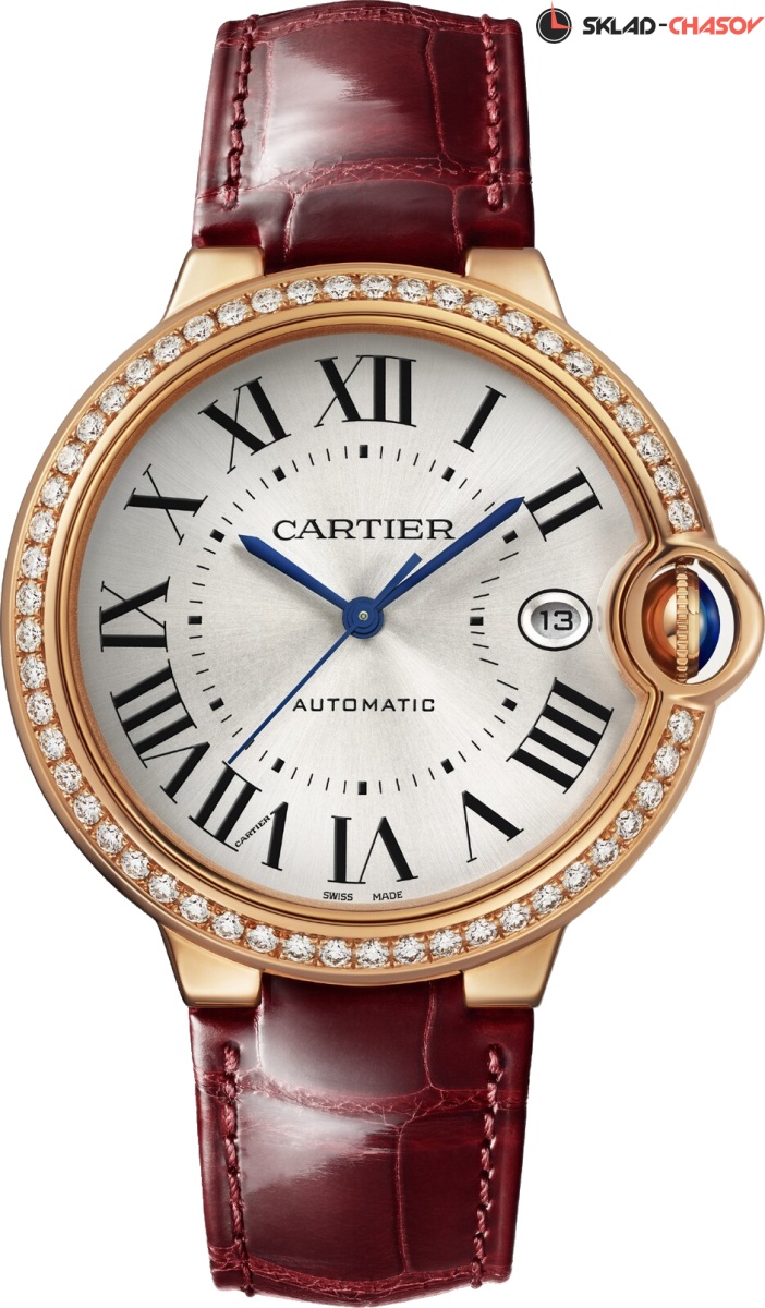 Модель Cartier WJBB0056 с ремешком из кожи аллигатора цвета бургунди, классическая застежка пряжка из розового золота 18K.