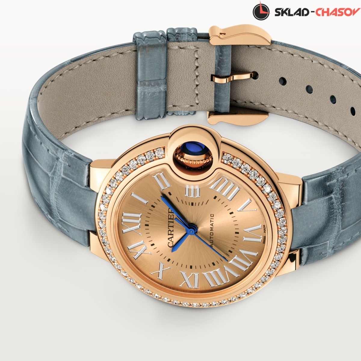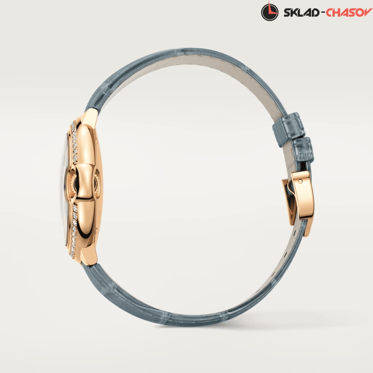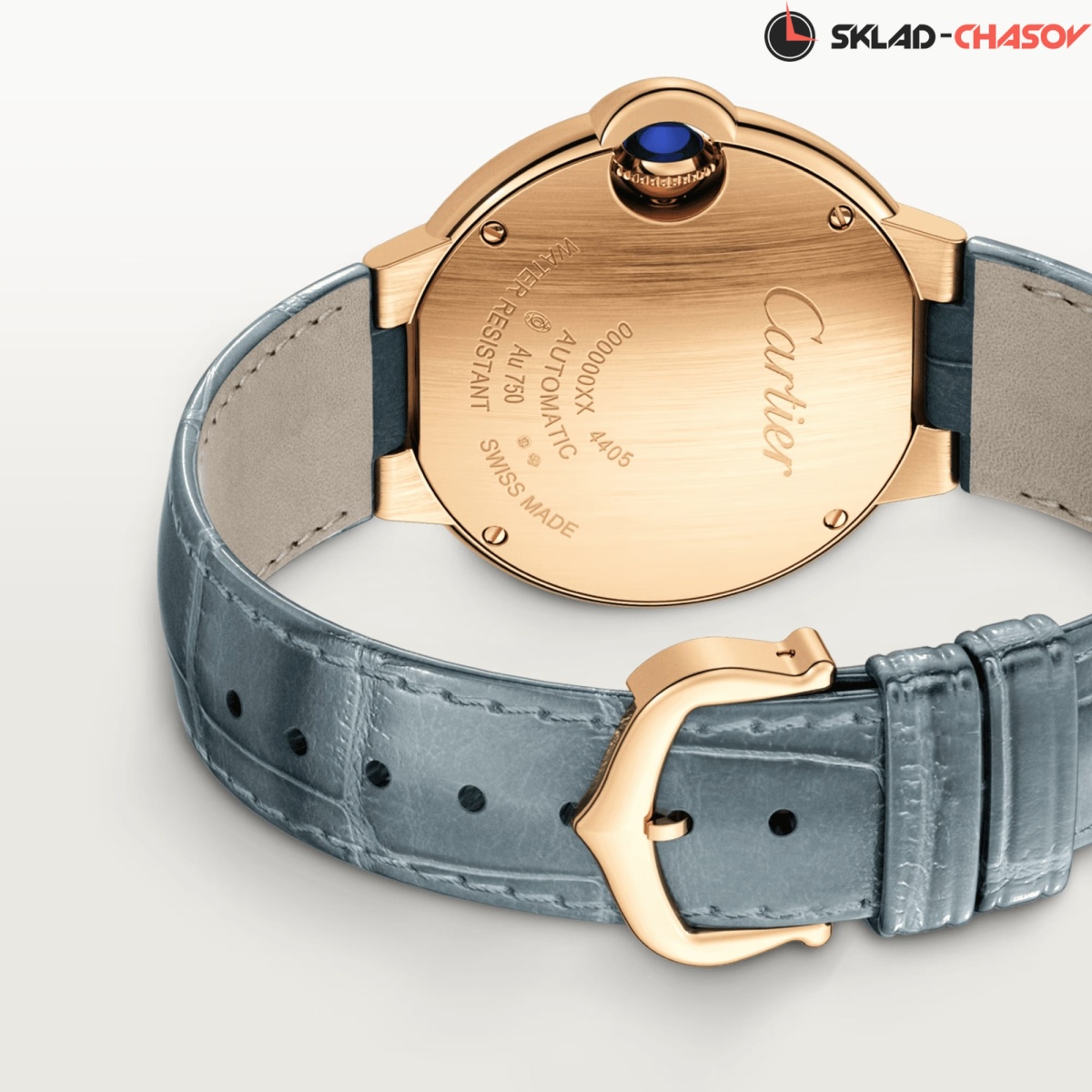 Модель Cartier WJBB0076 с ремешком из кожи аллигатора серого цвета, классическая застежка пряжка из розового золота 18K.