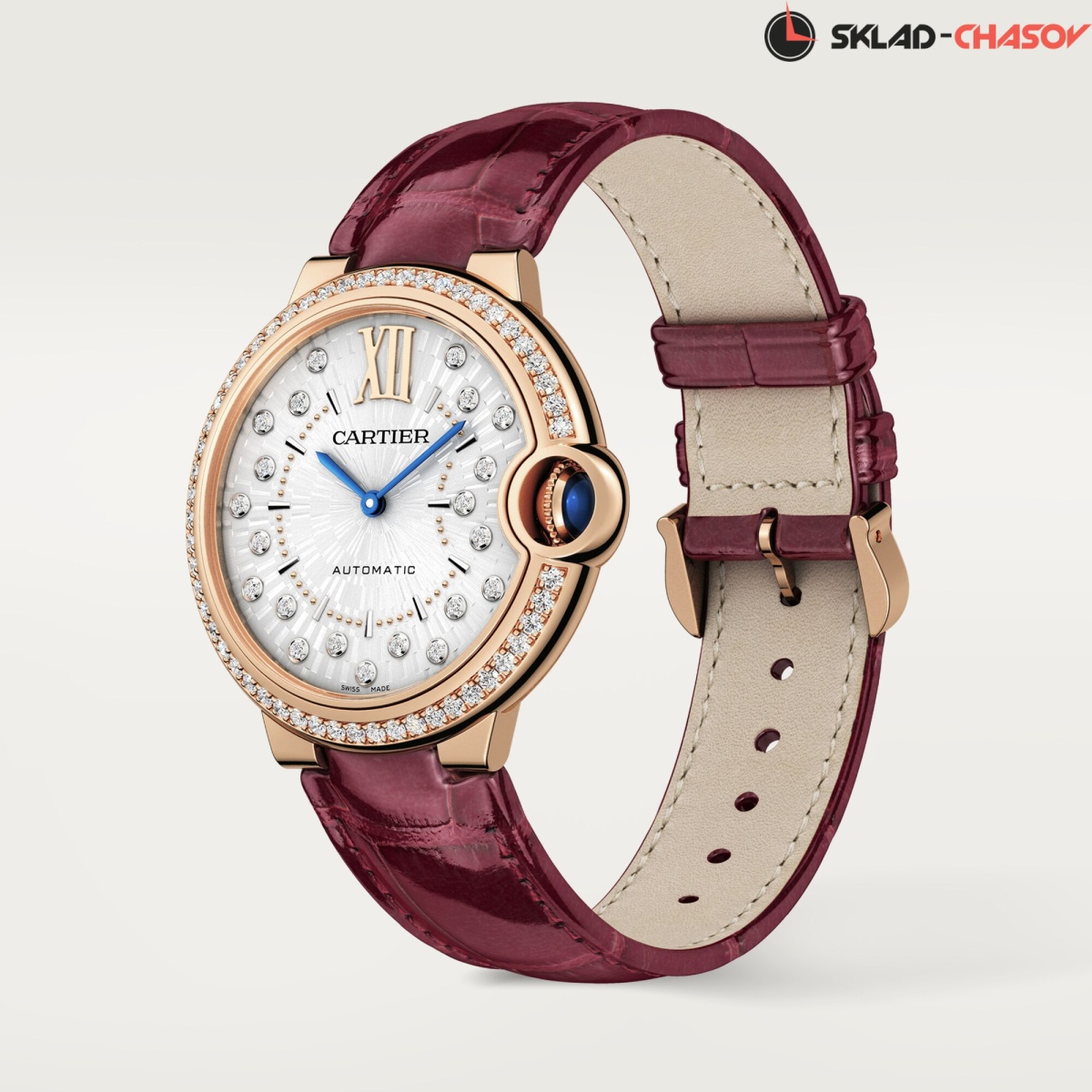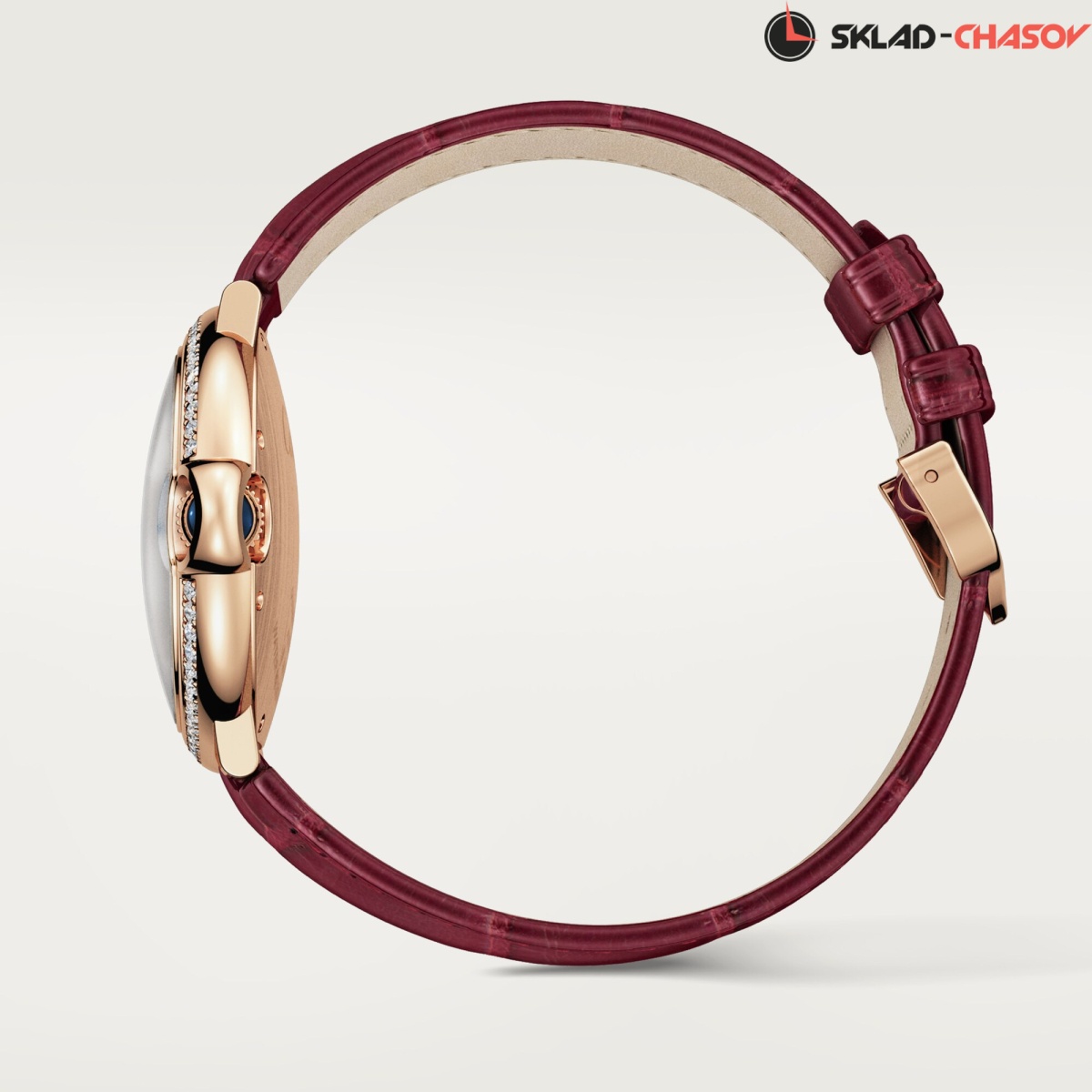 Модель Cartier WJBB0081 с ремешком из кожи аллигатора цвета бургунди, классическая застежка пряжка из розового золота 18K.