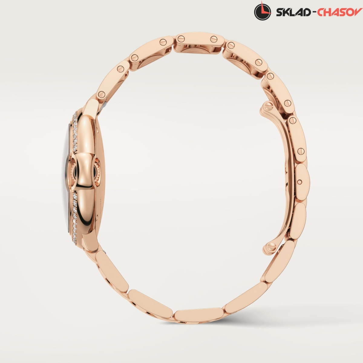 Модель Cartier WJBB0082 имеет литой браслет с 3 рядами звеньев и застежка бабочку, выполненые из розового золота 18K.