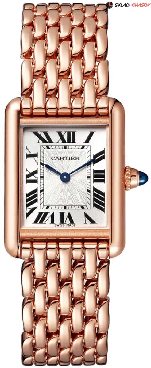 Модель Cartier Tank WGTA0023 имеет литой браслет с 7 рядами фирменных волнистых звеньев и застежка бабочку, выполненые из розового золота 18K.