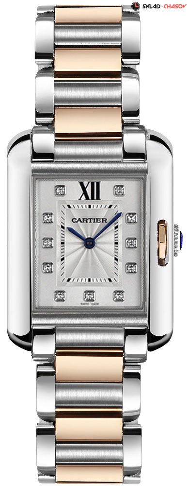 Модель Cartier Tank WT100024 имеет литой браслет с H-образными звеньями и застежка бабочку, выполненные из нержавеющей стали и розового золота 18К.