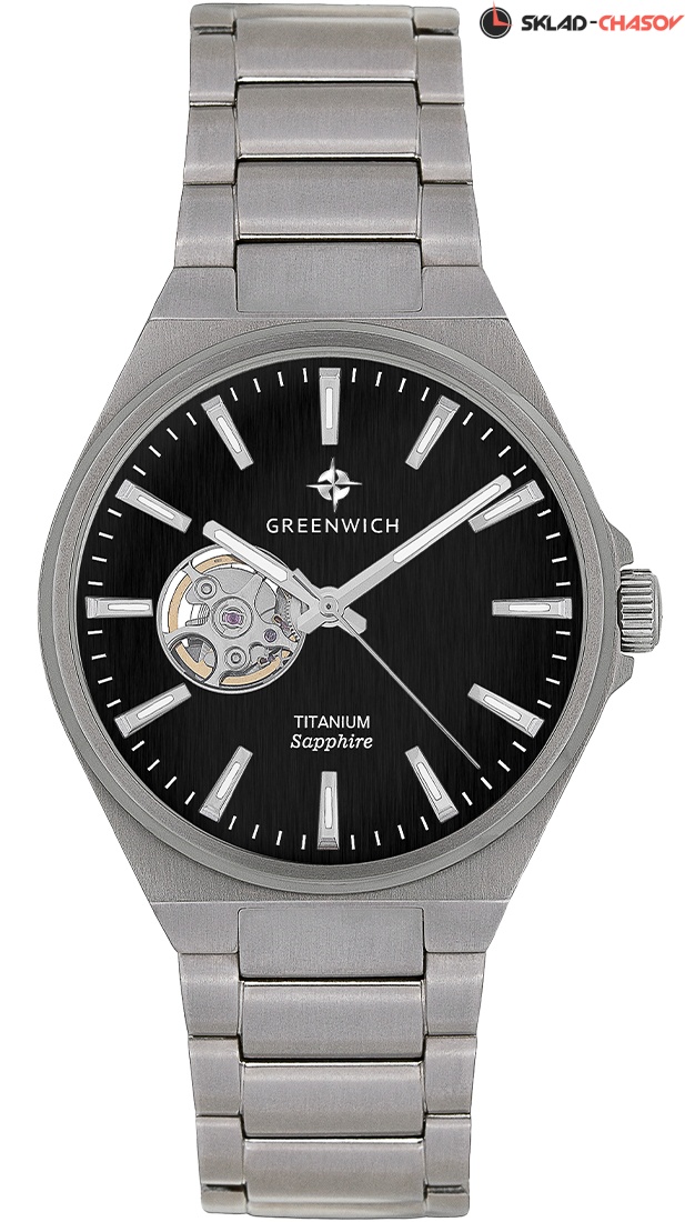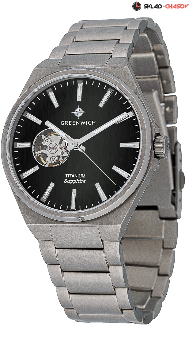 Легкость, прочность и гипоаллергенность: эти преимущества обеспечивает титан, из которого выполнены корпус и браслет часов Greenwich. Титановые часы действительно легче аналогичных моделей, сделанных из стали, что очень удобно для ежедневного использования. Титан идеально подходит для частых контактов с кожей запястья, так как практически не вызывает аллергических реакций. Корпус часов Dolphin имеет универсальный диаметр 41 мм, его конструкция предусматривает защиту для рельефной заводной головки. Черный циферблат, защищенный сапфировым стеклом, включает накладные риски, три стрелки (часовая и минутная с люминесцентным покрытием) и апертуру открытого баланса. Это круглое окошко, расположенное на 9 часах, приоткрывает тайну работы японского механизма TMI (калибр NH38), оснащенного автоподзаводом. Переверните часы — сквозь прозрачную заднюю крышку виден ротор, украшенный изображением корабля, на всех парусах несущегося навстречу приключениям. Повышенная водостойкость, равная 10 атмосфер, говорит о том, что часы можно оставить на запястье, даже если вы собираетесь плавать.