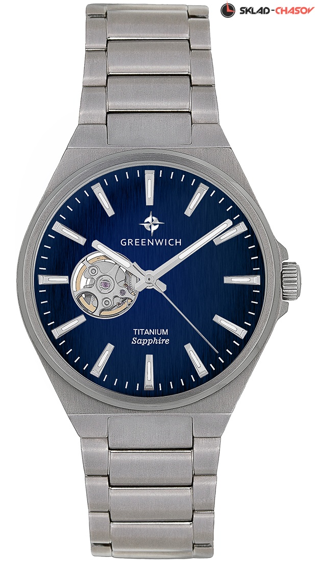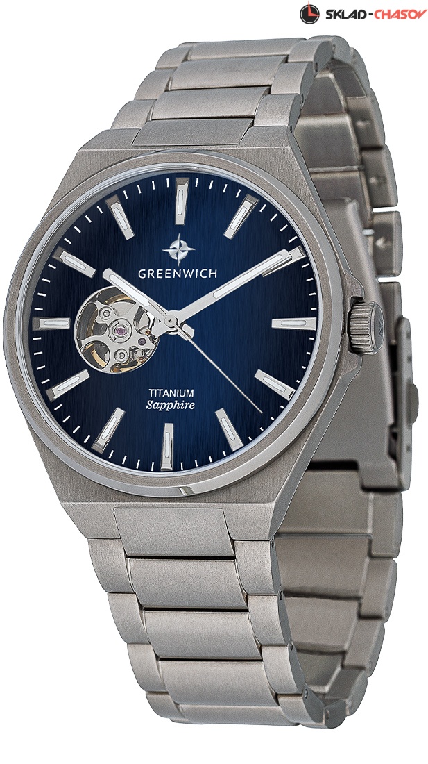 Легкость, прочность и гипоаллергенность: эти преимущества обеспечивает титан, из которого выполнены корпус и браслет часов Greenwich. Титановые часы действительно легче аналогичных моделей, сделанных из стали, что очень удобно для ежедневного использования. Титан идеально подходит для частых контактов с кожей запястья, так как практически не вызывает аллергических реакций. Корпус часов Dolphin имеет универсальный диаметр 41 мм, его конструкция предусматривает защиту для рельефной заводной головки. Синий циферблат, защищенный сапфировым стеклом, включает накладные риски, три стрелки (часовая и минутная с люминесцентным покрытием) и апертуру открытого баланса. Это круглое окошко, расположенное на 9 часах, приоткрывает тайну работы японского механизма TMI (калибр NH38), оснащенного автоподзаводом. Переверните часы — сквозь прозрачную заднюю крышку виден ротор, украшенный изображением корабля, на всех парусах несущегося навстречу приключениям. Повышенная водостойкость, равная 10 атмосфер, говорит о том, что часы можно оставить на запястье, даже если вы собираетесь плавать.