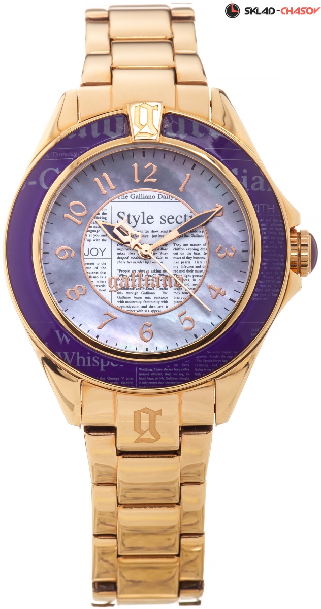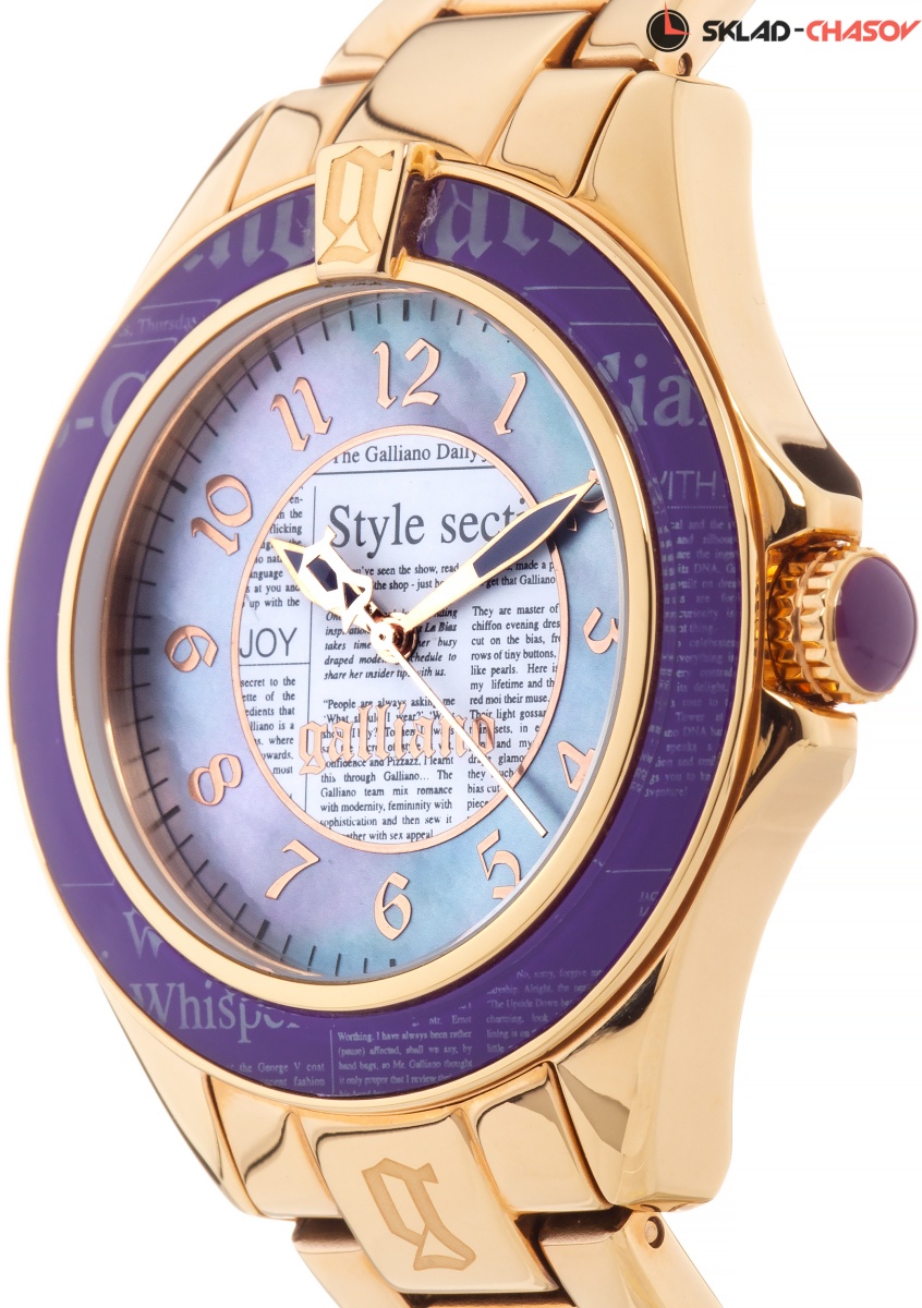 Часы с характерным для Galliano принтом ''газета'' для успешных женщин, жизнь которых постоянно двигается в активном, динамичном ритме большого города. Date Keeper. Безель из высокотехнологичной смолы. Заводная головка с защитой украшена камнем в форме кабошона. Циферблат и безель украшены принтом ''газета''.