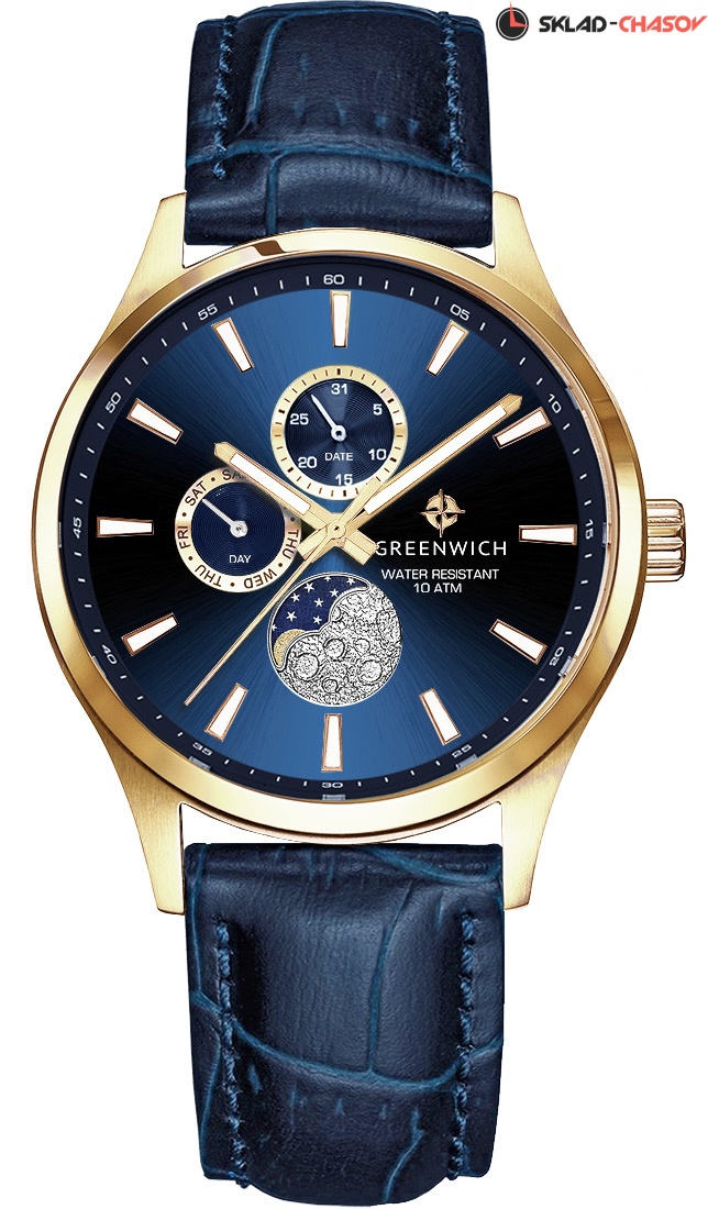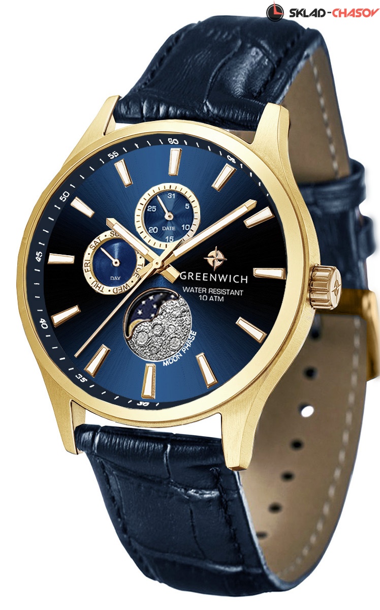 В часах привлекает сочетание спортивного дизайна и классических линий корпуса из нержавеющей стали с PVD-покрытием из желтого золота. Кварцевый механизм показывает время с точностью до секунды, дату, день недели. Все индикаторы на синем циферблате хорошо читаются, они выделены накладными рамками с зеркальной полировкой. В позиции «6 часов» расположен индикатор лунных фаз. Его украшением служит элемент с объемным рисунком, напоминающем изрытую кратерами поверхность спутника нашей планеты. Крупные стрелки и риски видны при любых условиях благодаря люминесцентному покрытию, которое в темноте светится приятным для глаз зеленоватым свечением. Повышенная водостойкость равна 10 атмосфер. Ремешок из натуральной кожи синего цвета с прошивкой удерживает на запястье застежка-пряжка с логотипом бренда.
