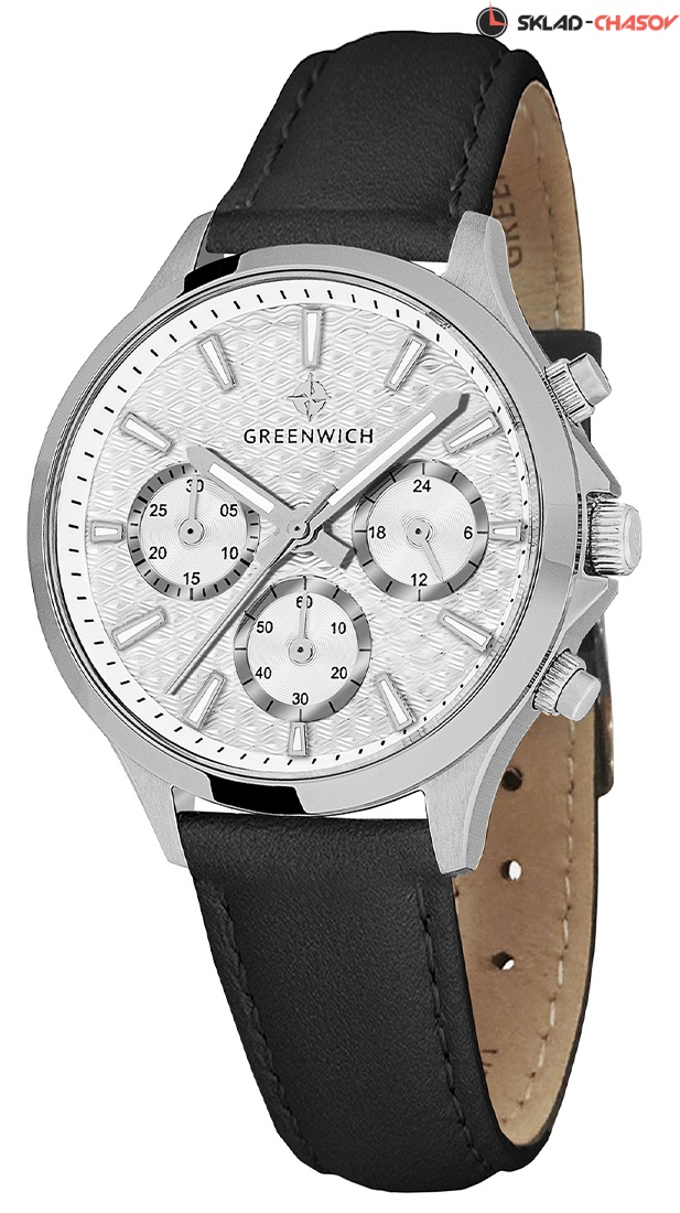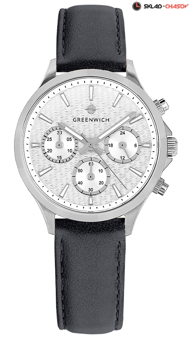 Часы GW 363.11.33 серии Mermaid - находка для тех, кто ищет надежные и, в тоже время, элегантные часы. Кварцевый механизм, установленный в 35-миллиметровый корпус из нержавеющей стали, оснащен функционалом хронографа: вынесенные на дополнительные индикаторы стрелки позволяют засекать время в минутах и секундах. Кроме этого, на белом циферблате разместили индикатор 24-часов. Каждый из индикаторов выделен накладной рамкой с зеркальной полировкой. Накладные риски и центральные стрелки покрыты люминесцентным составом. Элегантность модели подчеркивает гильоше: выполненное в виде волнообразных линий, оно дарит циферблату объем и глубину. В часах установлено минеральное стекло. Водостойкость 10 атмосфер. Хронограф серии Mermaid можно приобрести на ремешке из натуральной кожи черного цвета. Застежка-пряжка выполнена из нержавеющей стали.