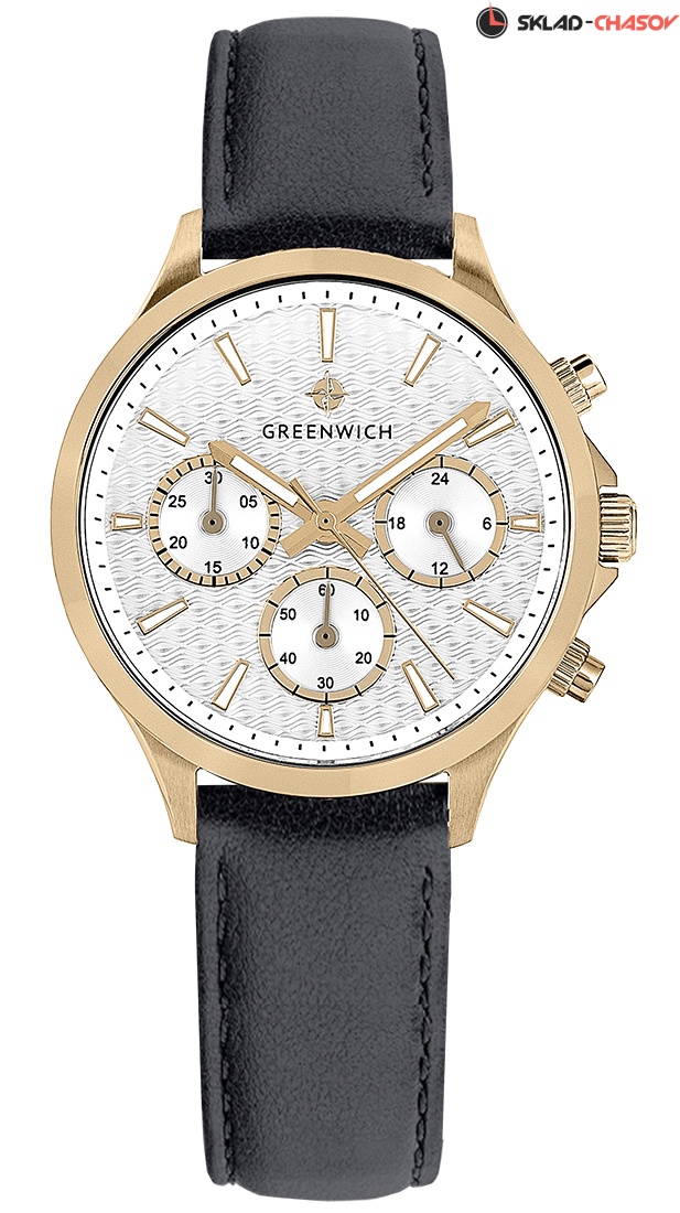 Часы GW 363.21.33 серии Mermaid - находка для тех, кто ищет надежные и, в тоже время, элегантные часы. Кварцевый механизм, установленный в 35-миллиметровый корпус из нержавеющей стали с PVD-покрытием из желтого золота, оснащен функционалом хронографа: вынесенные на дополнительные индикаторы стрелки позволяют засекать время в минутах и секундах. Кроме этого, на белом циферблате разместили индикатор 24-часов. Каждый из индикаторов выделен накладной рамкой с зеркальной полировкой. Накладные риски и центральные стрелки покрыты люминесцентным составом. Элегантность модели подчеркивает гильоше: выполненное в виде волнообразных линий, оно дарит циферблату объем и глубину. В часах установлено минеральное стекло. Водостойкость 10 атмосфер. Хронограф серии Mermaid можно приобрести на ремешке из натуральной кожи черного цвета. Застежка-пряжка выполнена из нержавеющей стали.