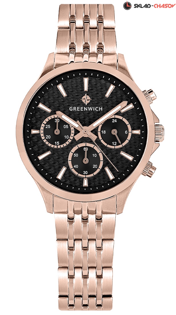 Часы GW 363.40.31 серии Mermaid - находка для тех, кто ищет надежные и, в тоже время, элегантные часы. Кварцевый механизм, установленный в 35-миллиметровый корпус из нержавеющей стали с PVD-покрытием из розового золота, оснащен функционалом хронографа: вынесенные на дополнительные индикаторы стрелки позволяют засекать время в минутах и секундах. Кроме этого, на черном циферблате разместили индикатор 24-часов. Каждый из индикаторов выделен накладной рамкой с зеркальной полировкой. Накладные риски и центральные стрелки покрыты люминесцентным составом. Элегантность модели подчеркивает гильоше: выполненное в виде волнообразных линий, оно дарит циферблату объем и глубину. В часах установлено минеральное стекло. Водостойкость 10 атмосфер. Хронограф серии Mermaid можно приобрести на браслете из звеньев, отполированных по-разному, с использованием зеркальной полировки и матирования. Застежка-клипса обладает удобной конструкцией: открыть ее можно с помощью двух боковых кнопок.