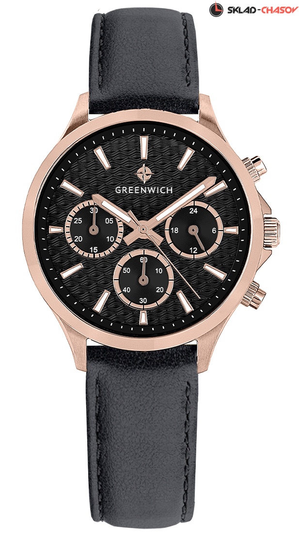 Часы GW 363.41.31 серии Mermaid - находка для тех, кто ищет надежные и, в тоже время, элегантные часы. Кварцевый механизм, установленный в 35-миллиметровый корпус из нержавеющей стали с PVD-покрытием из розового золота, оснащен функционалом хронографа: вынесенные на дополнительные индикаторы стрелки позволяют засекать время в минутах и секундах. Кроме этого, на черном циферблате разместили индикатор 24-часов. Каждый из индикаторов выделен накладной рамкой с зеркальной полировкой. Накладные риски и центральные стрелки покрыты люминесцентным составом. Элегантность модели подчеркивает гильоше: выполненное в виде волнообразных линий, оно дарит циферблату объем и глубину. В часах установлено минеральное стекло. Водостойкость 10 атмосфер. Хронограф серии Mermaid можно приобрести на ремешке из натуральной кожи черного цвета. Застежка-пряжка выполнена из нержавеющей стали.