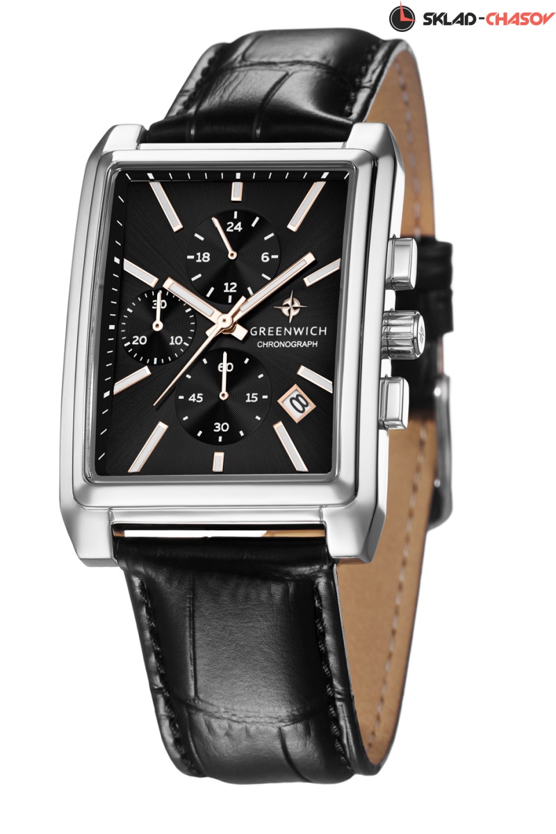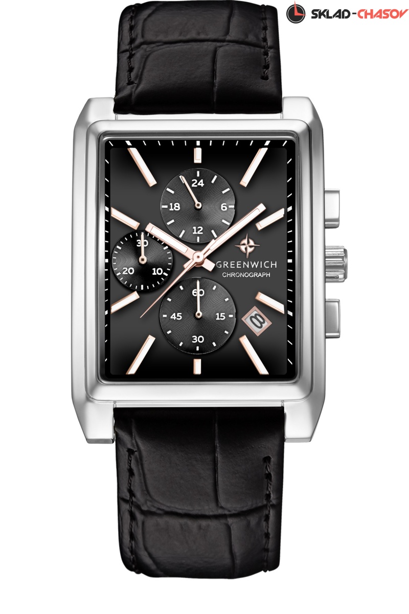 Индикация времени в 24-часовом формате, счетчик минут, секунд и дата: все эти функции, помимо точного времени, предусмотрены в кварцевых часах серии Galeon Chrono. На черном циферблате хорошо читаются риски и стрелки с люминесцентным покрытием и PVD-покрытием из розового золота, которое светится в темноте. Корпус из нержавеющей стали имеет прямоугольную форму — такие часы удобно лежат на запястье и смотрятся элегантно. Две кнопки на корпусе предназначены для управления дополнительными функциями хронографа (запуск/остановка/сброс значений). Для ремешка была выбрана натуральная кожа черного цвета, прошивка в тон продлевает срок его службы.
