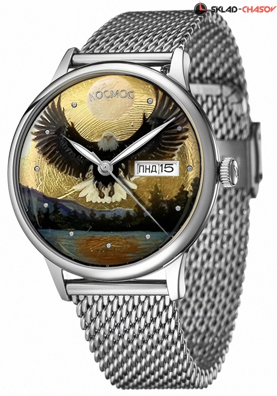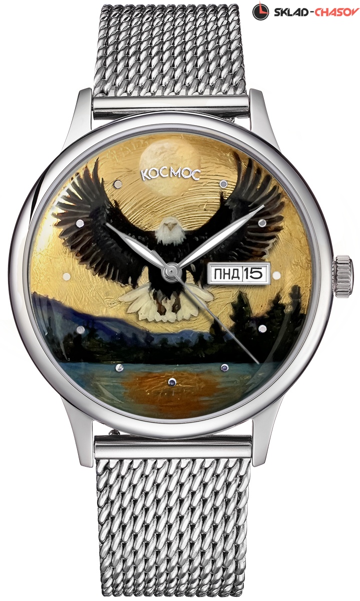 Мастера бренда Космос используют технику лаковой миниатюры с виртуозной детализацией. На основу наносится несколько слоев лака и краски, их чередование дарит эффект объема и ощущение динамики. Постепенно прорисовываются детали: на один сюжет требуется до 50 часов работы. Процесс запекания миниатюры в специальной печи придает рисунку необходимый блеск и завершенность. В часах установлен механизм TMI с функцией автоподзавода. Кроме часов, минут и секунд здесь предусмотрены дата и день недели. Их индикатор, выделенный накладной рамкой, вы найдете в позиции «3 часа». За движением деталей механизма можно наблюдать, стоит только перевернуть часы: задняя крышка прозрачная. Часовая и минутная стрелки покрыты люминесцентным составом, который светится в темноте. Минеральное стекло сделано по технологии, характерной для 60-70-х годов прошлого века: оно выпуклое с обеих сторон. Нити из нержавеющей стали в браслете складываются в особое плетение, названное «миланским». Оно придает браслету гибкость, сохраняя, при этом, прочность. Специальная застежка позволяет легко регулировать длину браслета самостоятельно. Корпус и браслет декорированы PVD-покрытием из розового золота.