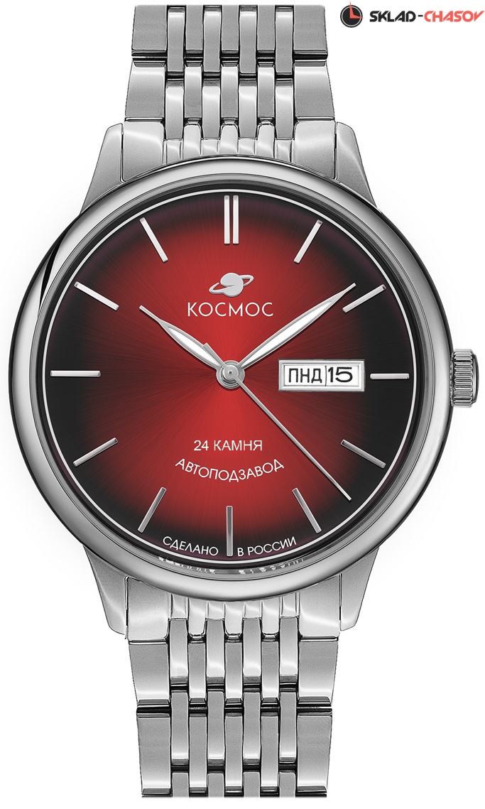 Красный циферблат выполнен в ретро стиле, края его выгнуты, для чего требуется использование сложной технологии в производстве. Циферблаты такой формы создавали в часах прошлых лет. Кончик секундной стрелки выгнут по форме циферблата. На выпуклом градиентном циферблате выполнена шлифовка в стиле солнечных лучей и размещены изготовленные вручную индексы, которые крепятся на двух штифтах. В модели представлены дополнительные функции даты и дня недели. На часовую, минутную стрелки, и круг по краю циферблата, напоминающий ореол по краю Земли, нанесено люминесцентное покрытие, которое светится в темноте, создавая необычное изображение.