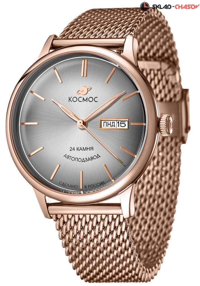 Полированный корпус часов из нержавеющей стали с PVD-покрытием из розового золота напоминает силуэт летающей тарелки благодаря выпуклым формам стекла и нижней части корпуса. Дополняют образ стальные ушки корпуса, напоминающие ее опоры. На задней крышке часов выгравирован фантазийный сюжет – космическая станция будущего.