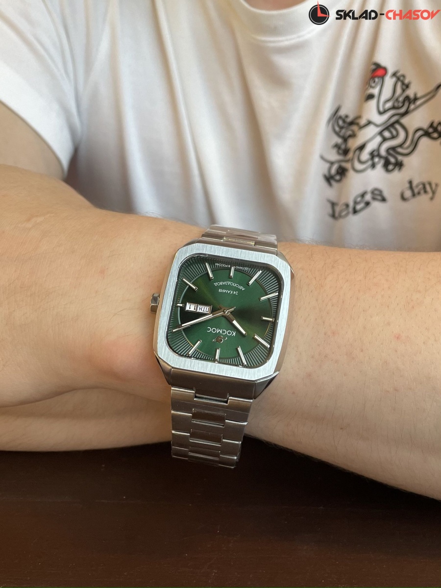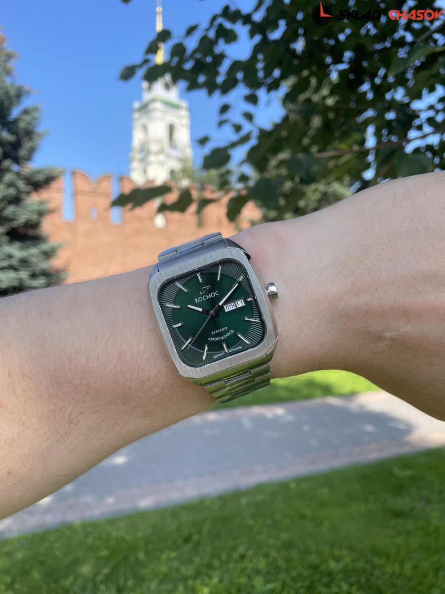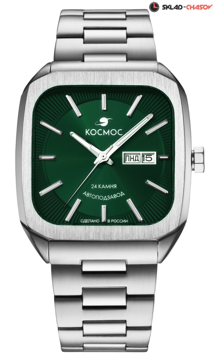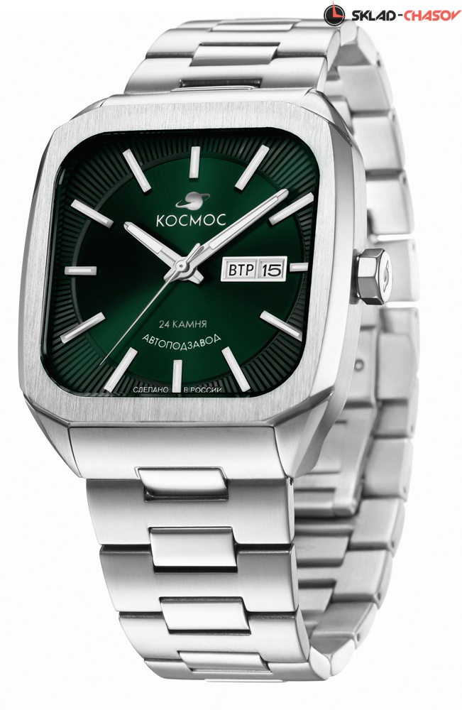 Корпус часов в форме квадрата с закругленными углами сделан из нержавеющей стали, украшенной зеркальной полировкой и сатинированием. Удобная заводная головка имеет форму гайки. Задняя крышка прозрачная, что традиционно для механических часов. Сквозь это специальное окошко можно увидеть работу механизма TMI. Его подвижный ротор не только позволяет заводить пружину механизма от обычных движений руки, но и несет важную информацию: на нем вы увидите надпись «Сделано в России». Украшением служит гравировка, изображающая космонавта. Задняя крышка крепится на четырех винтах, что обеспечивает повышенную водостойкость в 10 атмосфер (100 метров). Цифры в формате от 001/200 до 200/200 обозначают индивидуальный номер модели. Ушки корпуса имеют эргономичную форму — это позволяет часам комфортно лежать на запястье. Объемный циферблат зеленого цвета состоит из двух уровней. В центре первого движутся три стрелки, часовая и минутная - с люминесцентным покрытием. Второй уровень декорирован гильоше в виде солнечных лучей. Индексы накладные, как и стальная рамка, выделяющая сдвоенное окошко даты и дня недели. Обратите внимание, что для индикации дня недели используется два языка: русский и английский. Сапфировое стекло с антибликовым покрытием обеспечивает защиту циферблата и хорошую читаемость показаний, независимо от условий видимости.