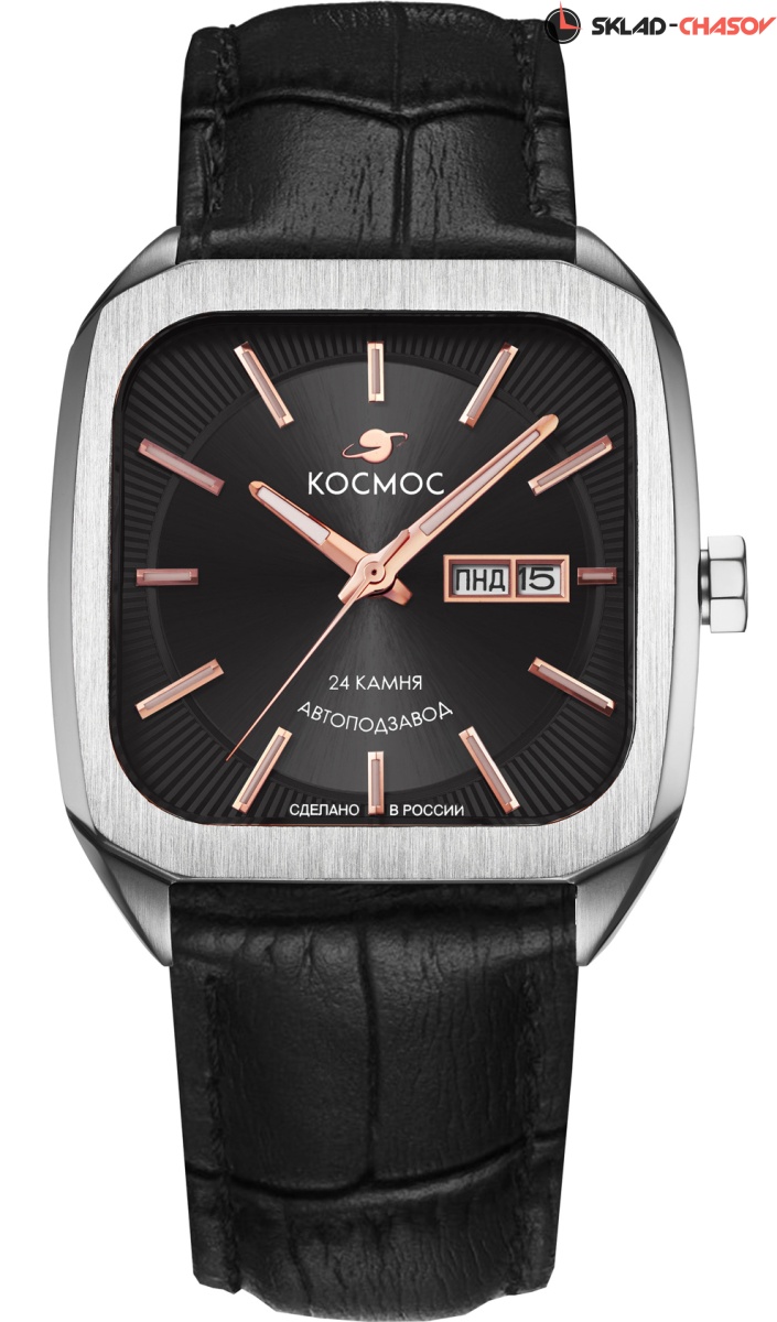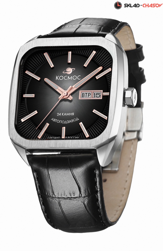 Корпус часов в форме квадрата с закругленными углами сделан из нержавеющей стали, украшенной зеркальной полировкой и сатинированием. Удобная заводная головка имеет форму гайки. Задняя крышка прозрачная, что традиционно для механических часов. Сквозь это специальное окошко можно увидеть работу механизма TMI. Его подвижный ротор не только позволяет заводить пружину механизма от обычных движений руки, но и несет важную информацию: «Сделано в России». Украшением служит гравировка, изображающая космонавта. Задняя крышка крепится на четырех винтах, что обеспечивает повышенную водостойкость в 10 атмосфер (100 метров). Цифры в формате от 01/50 до 50/50 (первый выпуск) и от 051/100 до 100/100 (второй выпуск) обозначают индивидуальный номер модели. Ушки корпуса имеют эргономичную форму — это позволяет часам комфортно лежать на запястье. Объемный циферблат черного цвета состоит из двух уровней. В центре первого движутся три стрелки, часовая и минутная - с люминесцентным покрытием. Второй уровень декорирован гильоше в виде солнечных лучей. Индексы накладные, как и стальная рамка, выделяющая сдвоенное окошко даты и дня недели. Обратите внимание, что для индикации дня недели используется два языка: русский и английский. Сапфировое стекло с антибликовым покрытием обеспечивает защиту циферблата и хорошую читаемость показаний, независимо от условий видимости.