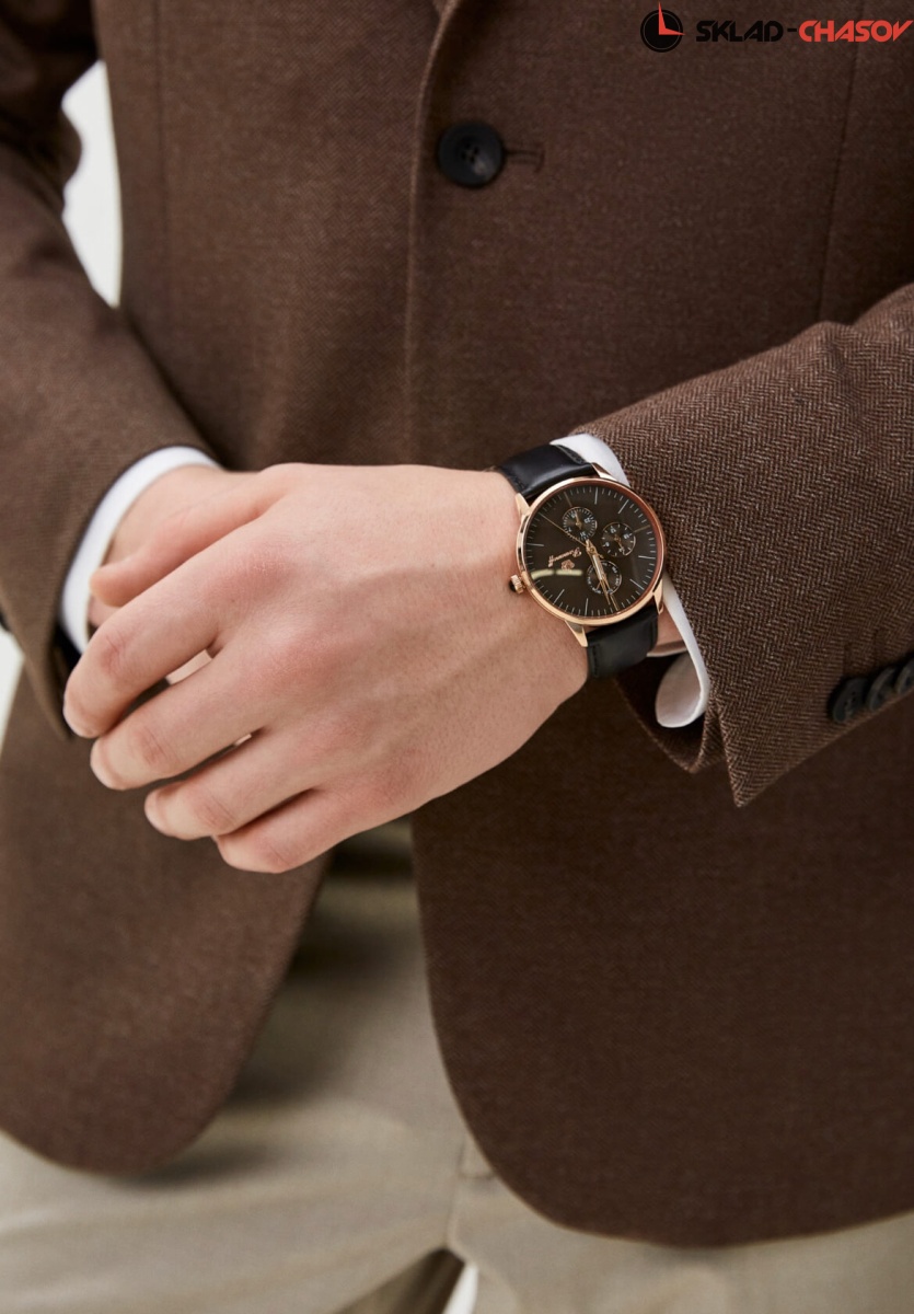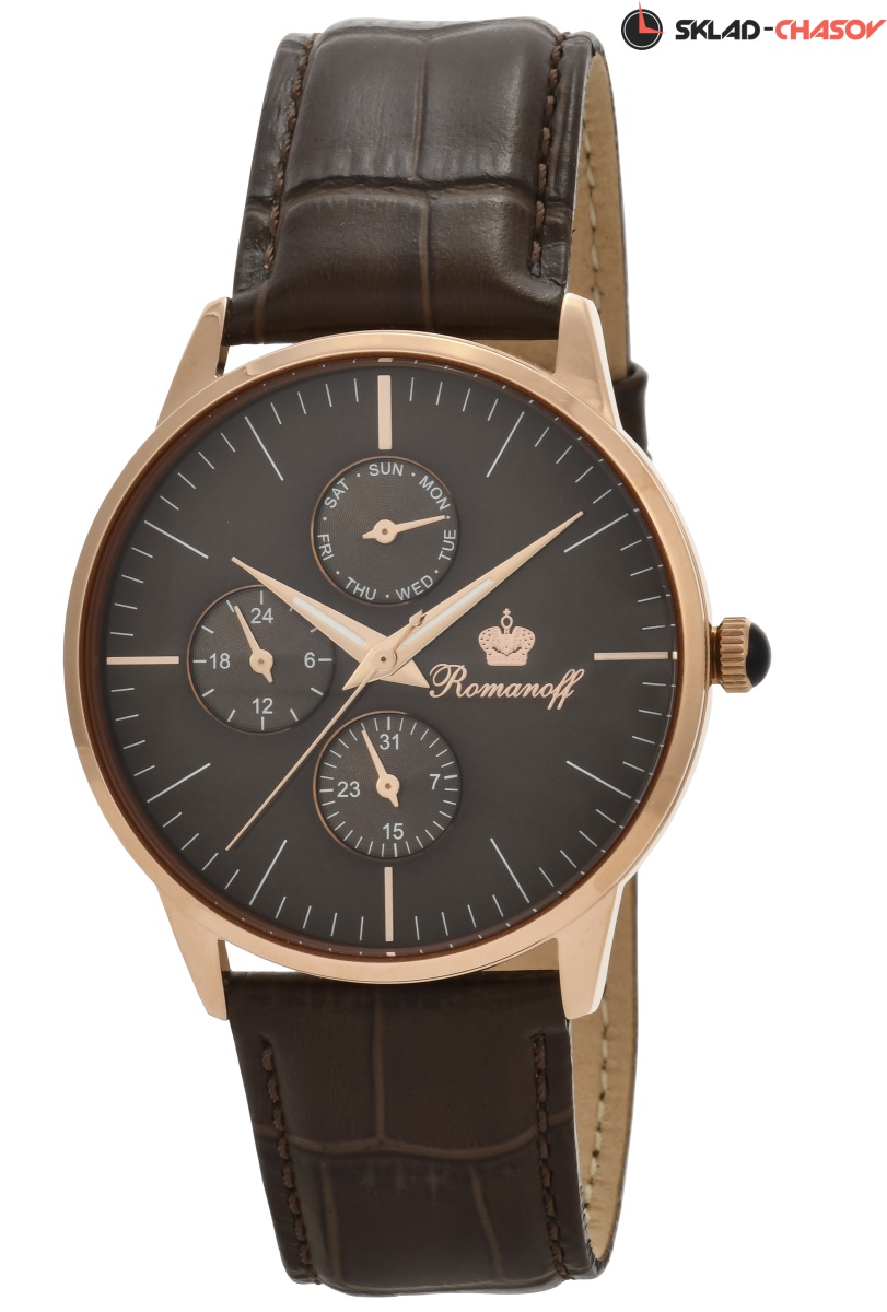 Циферблат: люминесцентные позолоченные стрелки, темно-коричневый