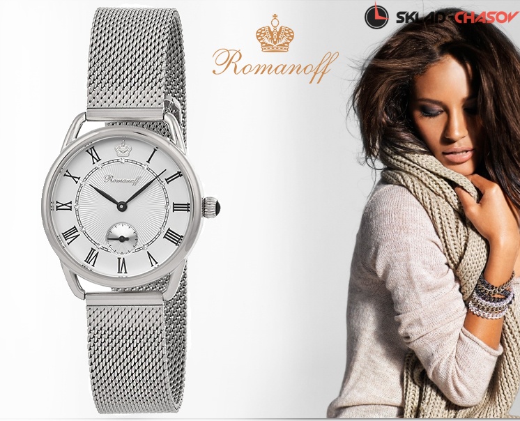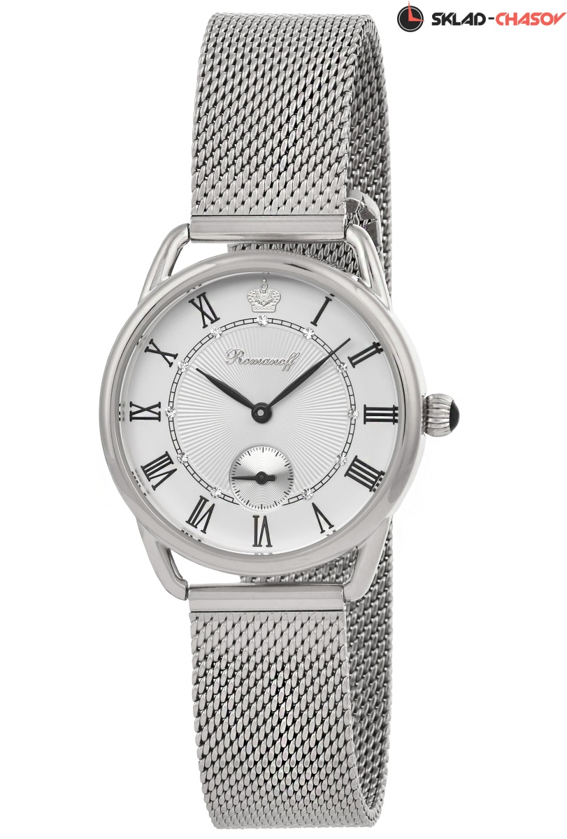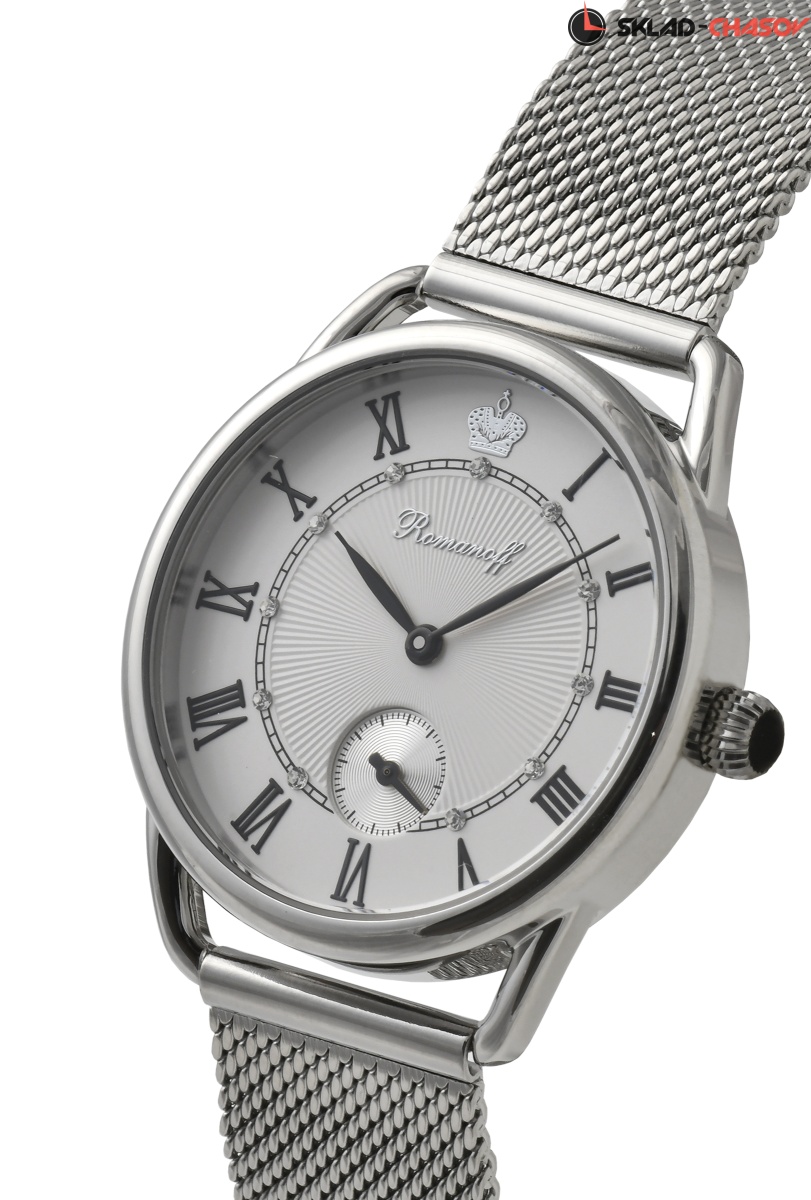 Циферблат: цвет - белый, фигурная чеканка, накладные римские цифры, кристаллы Swarovski в бриллиантовой огранке, серебряная накладная корона