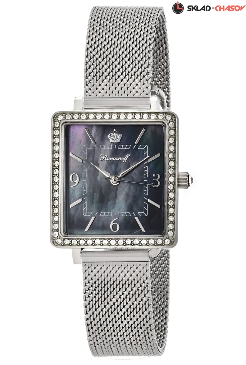 Циферблат: серебряные стрелки, черный натуральный морской перламутр, серебряные арабские цифры и индексы, объемная императорская корона