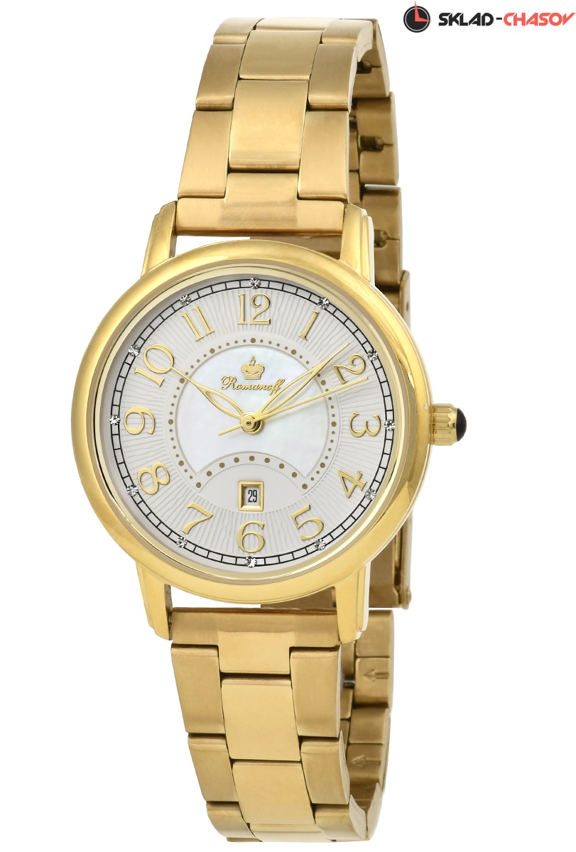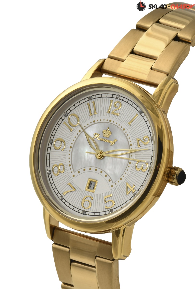 Циферблат: белый натуральный морской перламутр, кристаллы Swarovski в бриллиантовой огранке, фигурная чеканка, золотые накладные арабские цифры