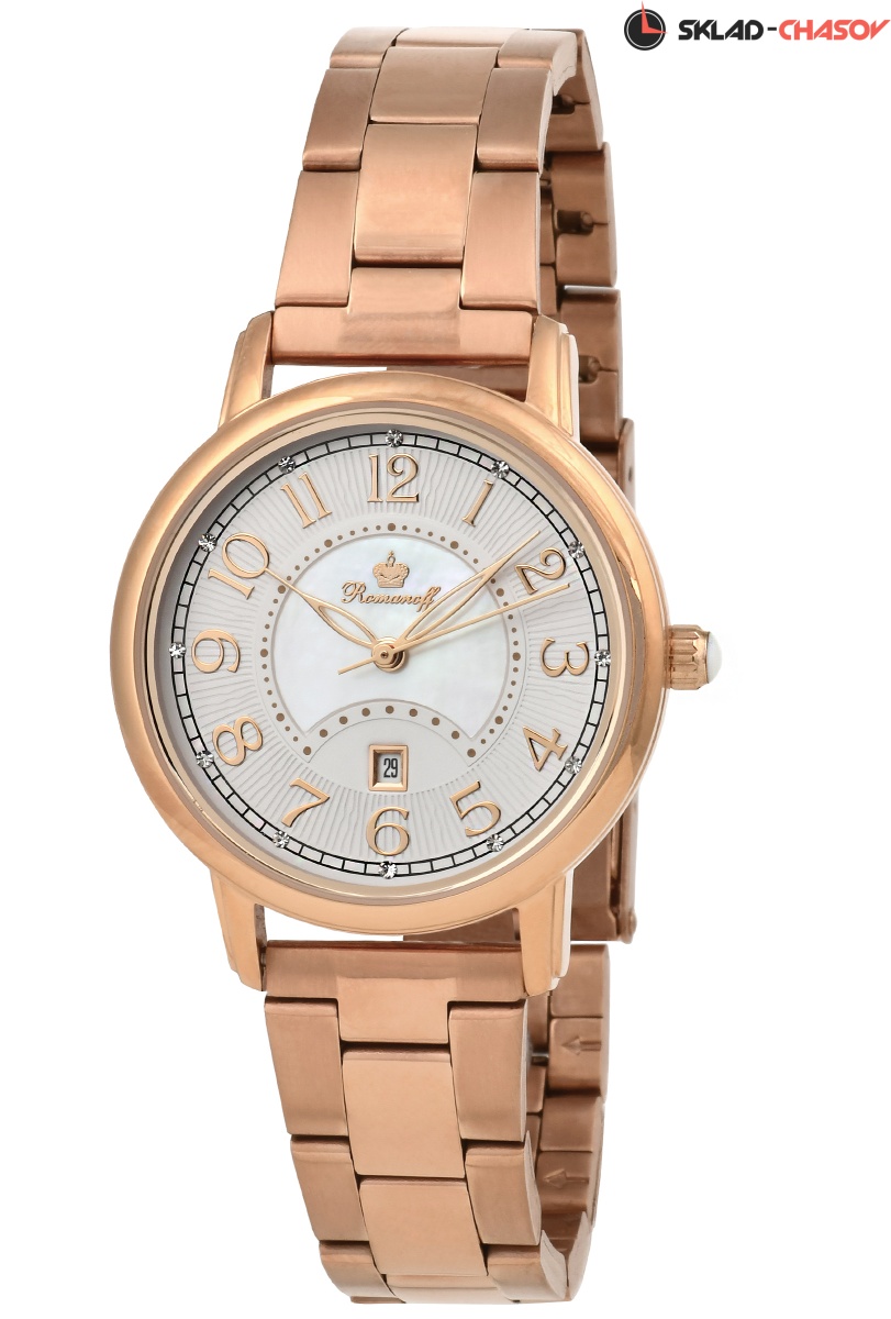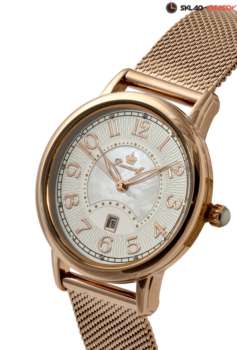 Циферблат: белый натуральный морской перламутр, кристаллы Swarovski в бриллиантовой огранке, фигурная чеканка, золотые накладные арабские цифры