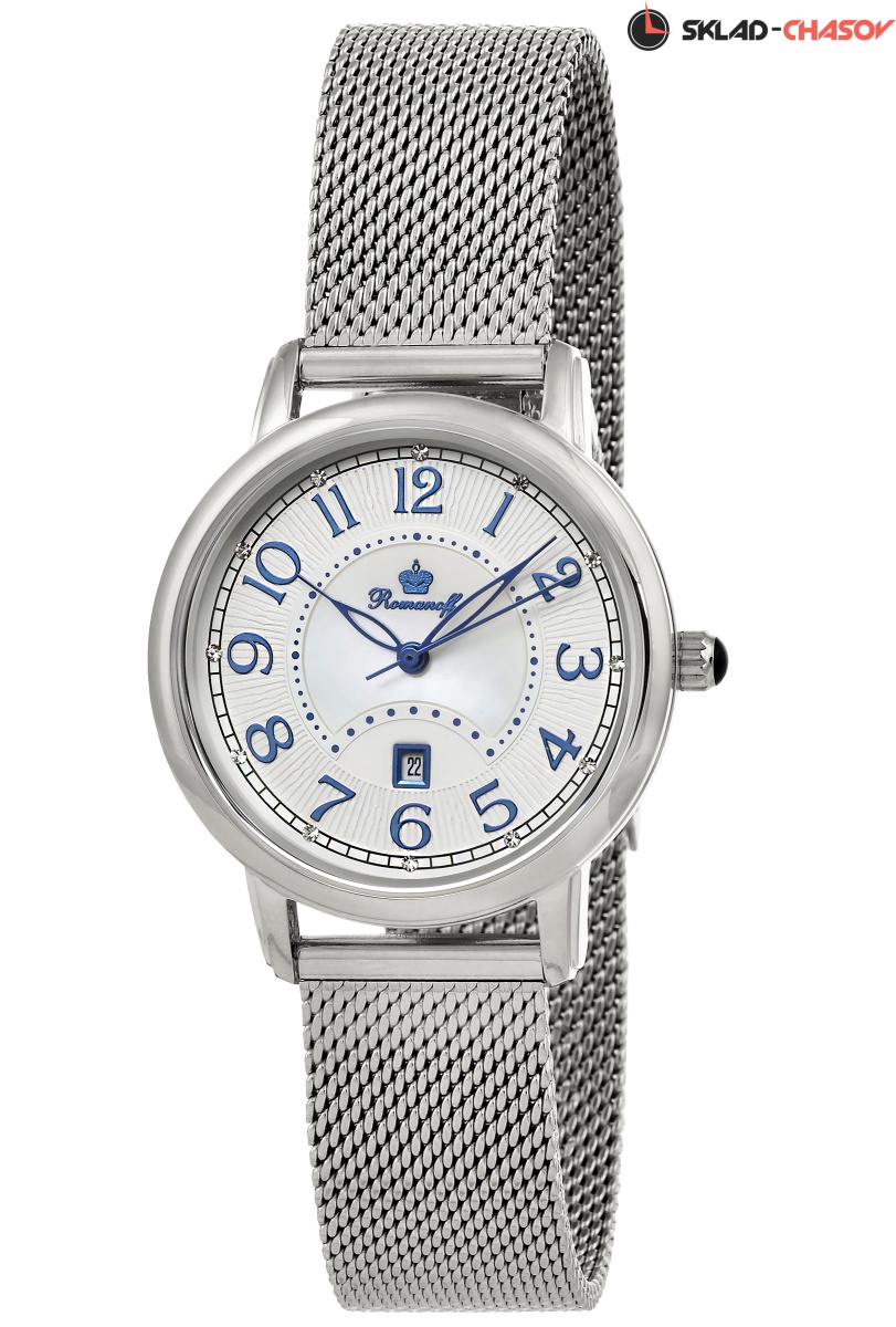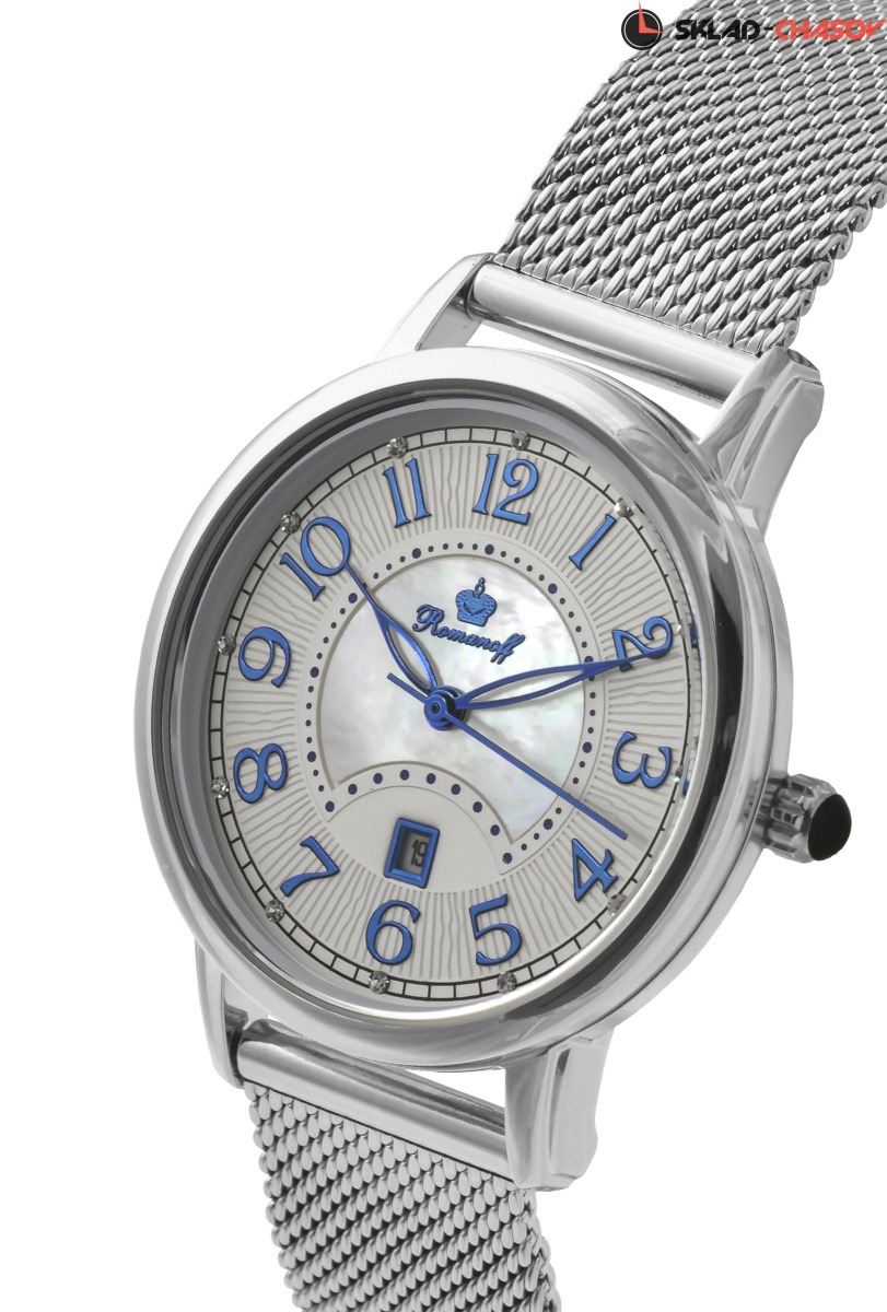 Циферблат: белый натуральный морской перламутр, кристаллы Swarovski в бриллиантовой огранке, фигурная чеканка, синенные накладные арабские цифры