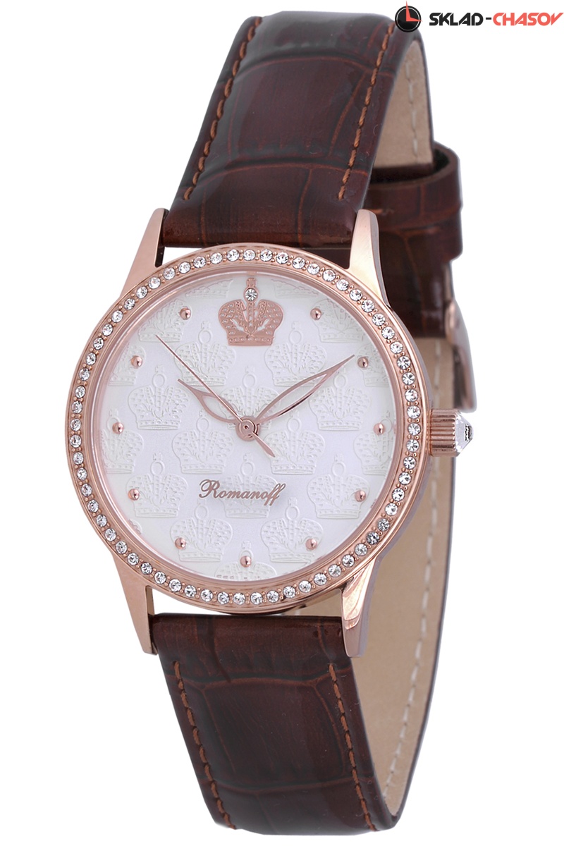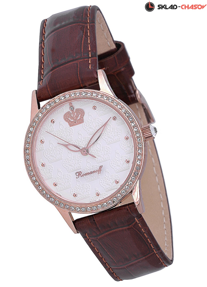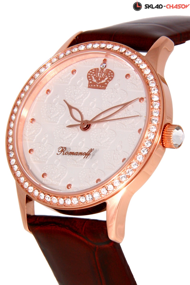 Циферблат: цвет - белый, фигурная чеканка, кристаллы Swarovski, индексы на цифрах, объемные короны