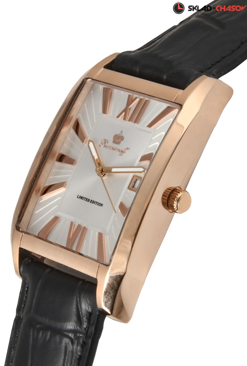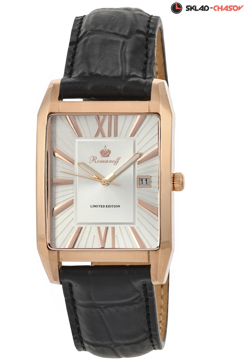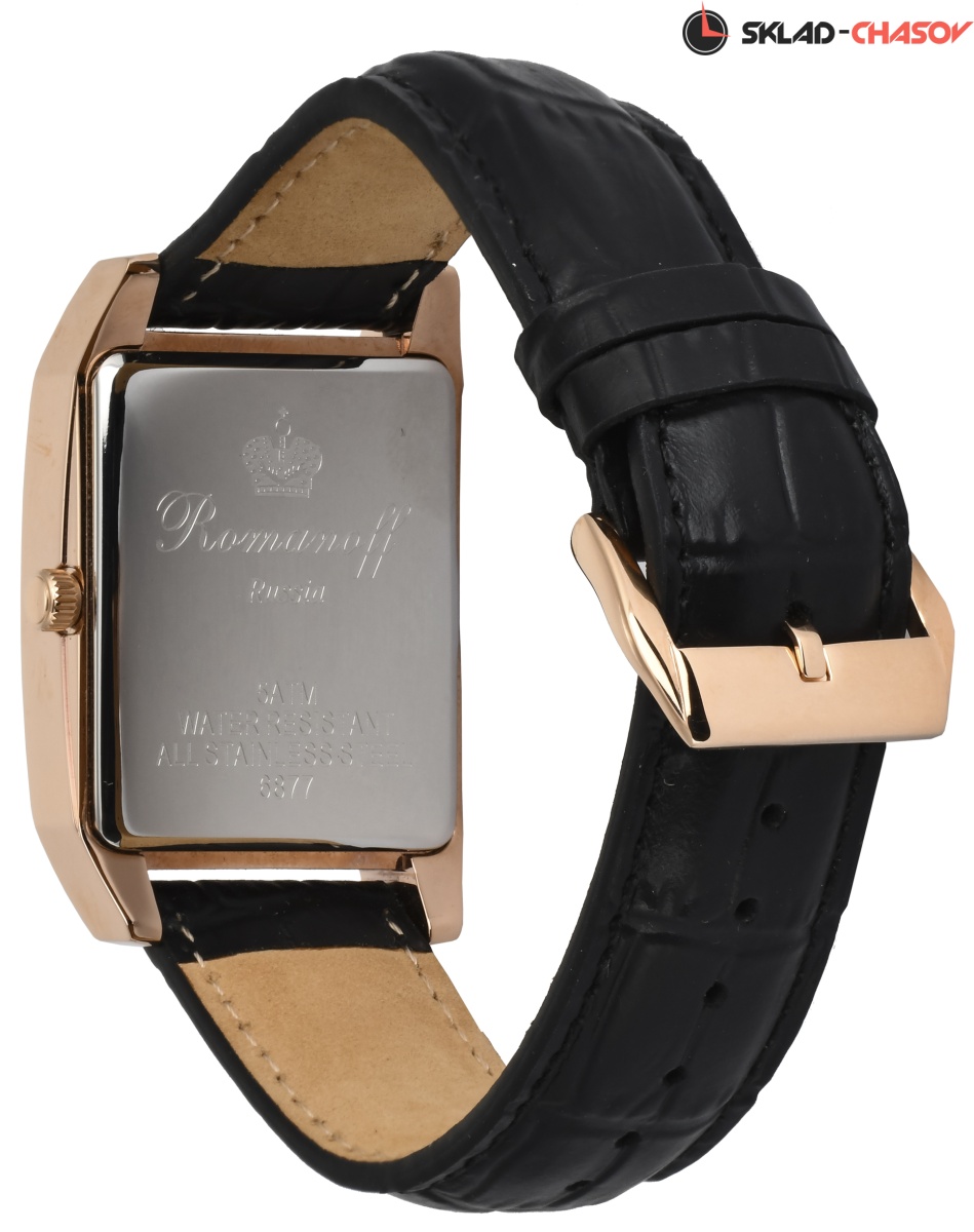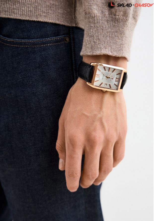 Циферблат: цвет - светло-серебристый, фигурная чеканка, золотые объемные римские цифры и индексы, люминесцентные золотые стрелки