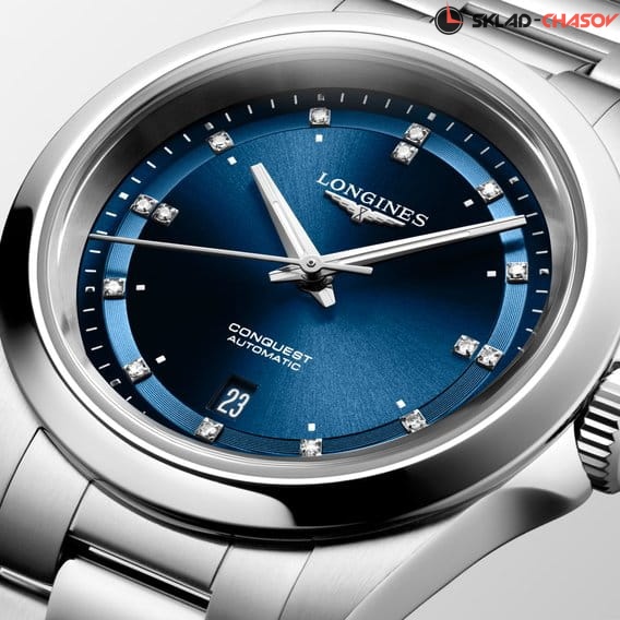 Longines Conquest L3.320.4.97.6 — изысканные женские часы, сочетающие современную элегантность с выразительными ювелирными акцентами. Корпус диаметром 30 мм выполнен из нержавеющей стали и обладает утончённым силуэтом, подчёркнутым бриллиантовым безелем — 48 камней Top Wesselton IF–VVS общей массой около 0,326 карата придают модели благородное сияние.