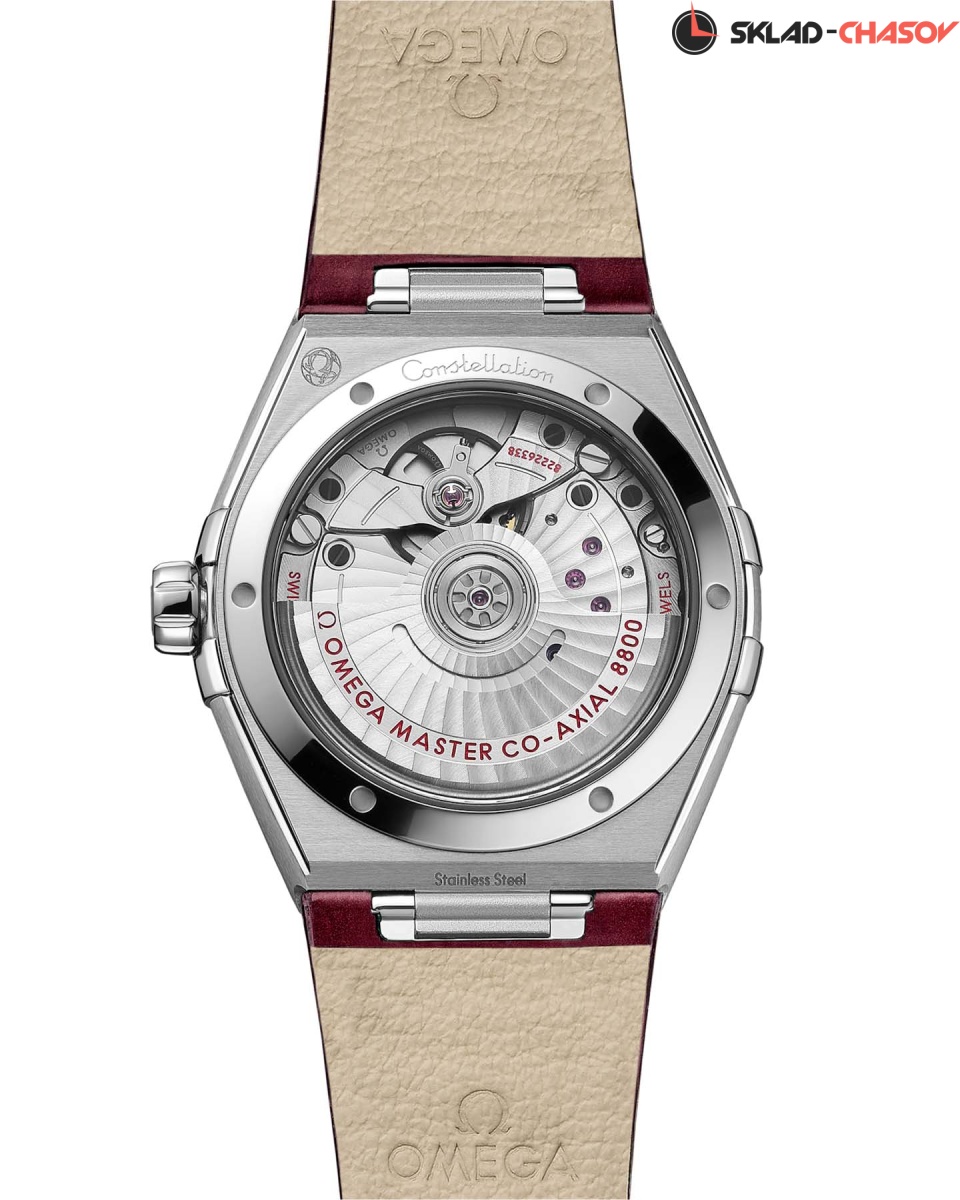 Драматичный и запоминающийся дизайн OMEGA Constellation характеризуется знаменитыми гранями полумесяца и «скобами» на корпусе. Эта 36-миллиметровая модель из нержавеющей стали оснащена полированным безелем с 38 бриллиантами, бордовым циферблатом с PVD-покрытием, матовым покрытием и окошком даты в положении «6 часов». Стрелки, логотип OMEGA, звезда Constellation и индексы выполнены из белого золота 18 карат. Знаменитый монобраслет Constellation заменен на кожаный ремешок того же цвета, что и циферблат. Сердцем этих часов является коаксиальный хронометр OMEGA Master Chronometer Calibre 8800, видимый через устойчивое к царапинам сапфировое стекло.