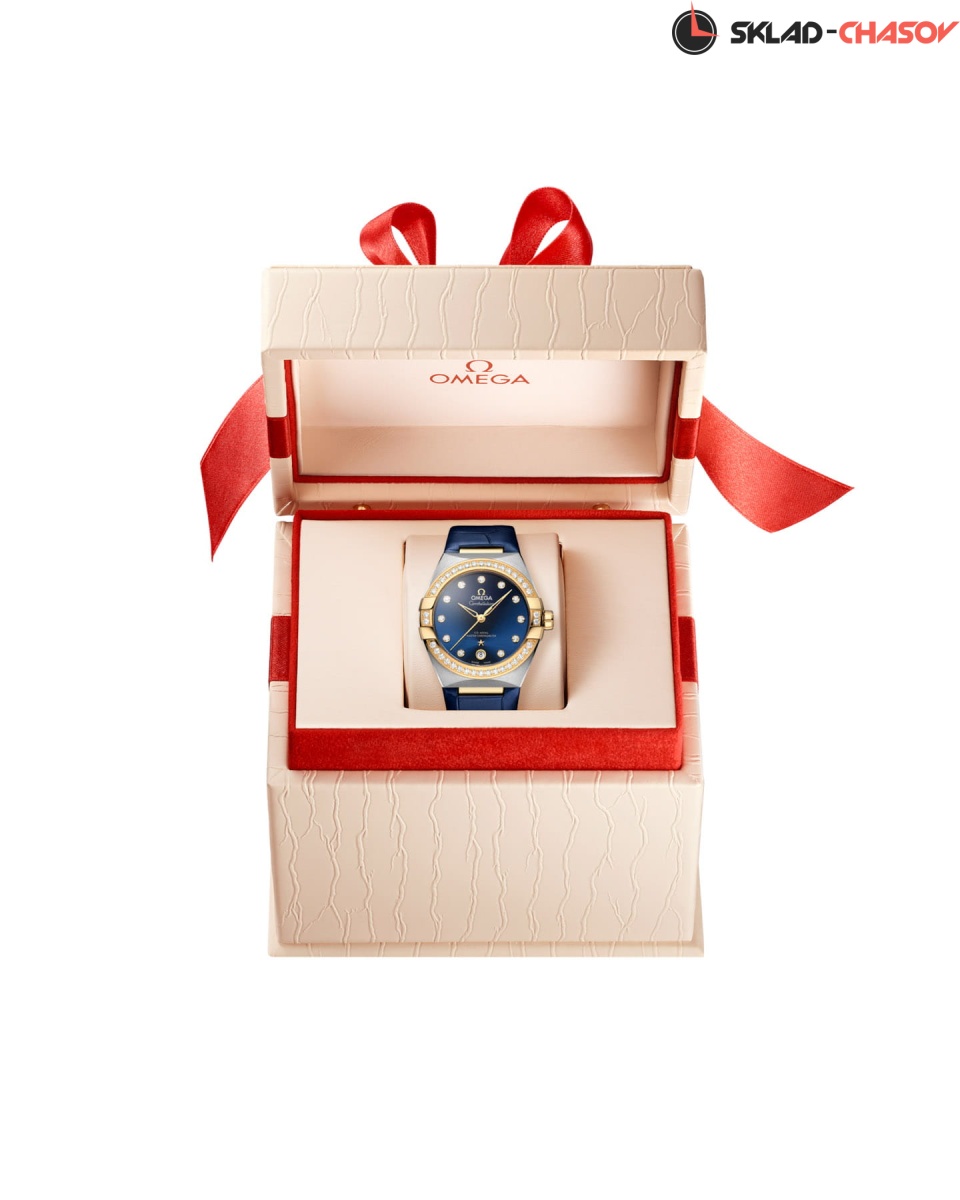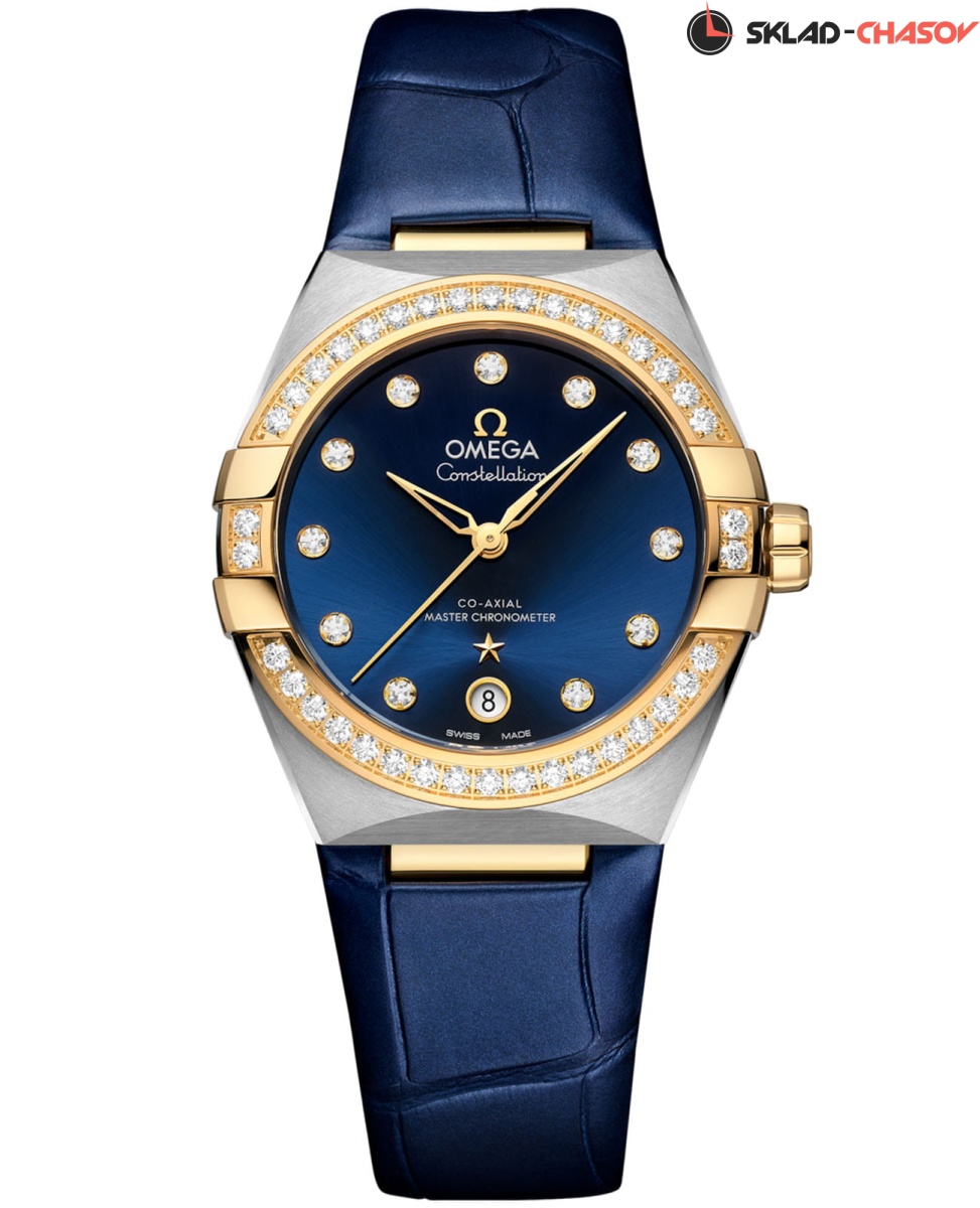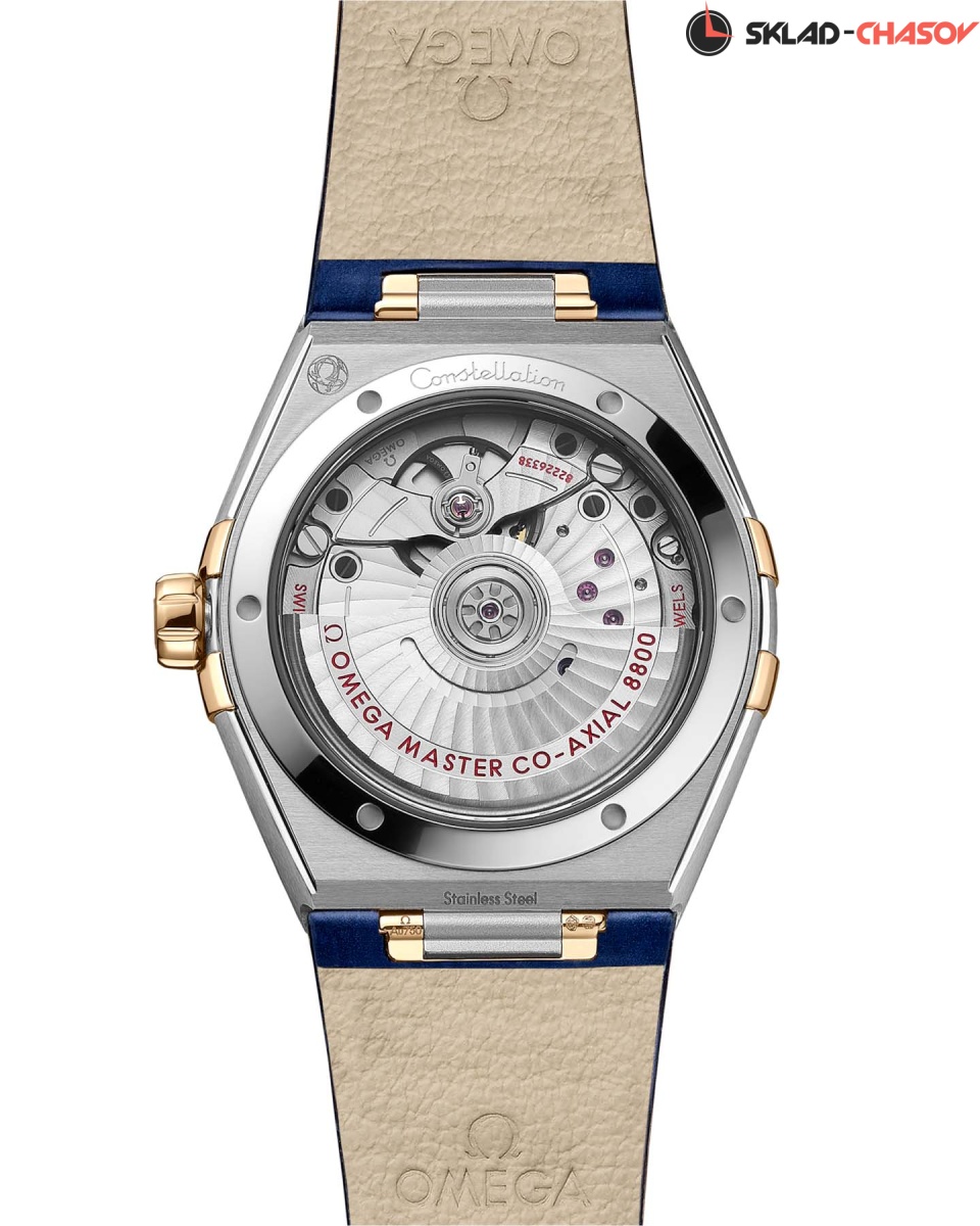 Драматичный и запоминающийся дизайн OMEGA Constellation характеризуется знаменитыми гранями полумесяца и «скобами» на корпусе. Эта 36-миллиметровая модель из нержавеющей стали и желтого золота 18 карат оснащена полированным безелем с 38 бриллиантами, синим циферблатом с PVD-покрытием, матовым покрытием от солнца и окошком даты в положении «6 часов». Стрелки, логотип OMEGA, звезда Созвездия и индексы выполнены из желтого золота 18 карат. Знаменитый монобраслет Constellation заменен на кожаный ремешок того же цвета, что и циферблат. Сердцем этих часов является коаксиальный хронометр OMEGA Master Chronometer Calibre 8800, видимый через устойчивое к царапинам сапфировое стекло.